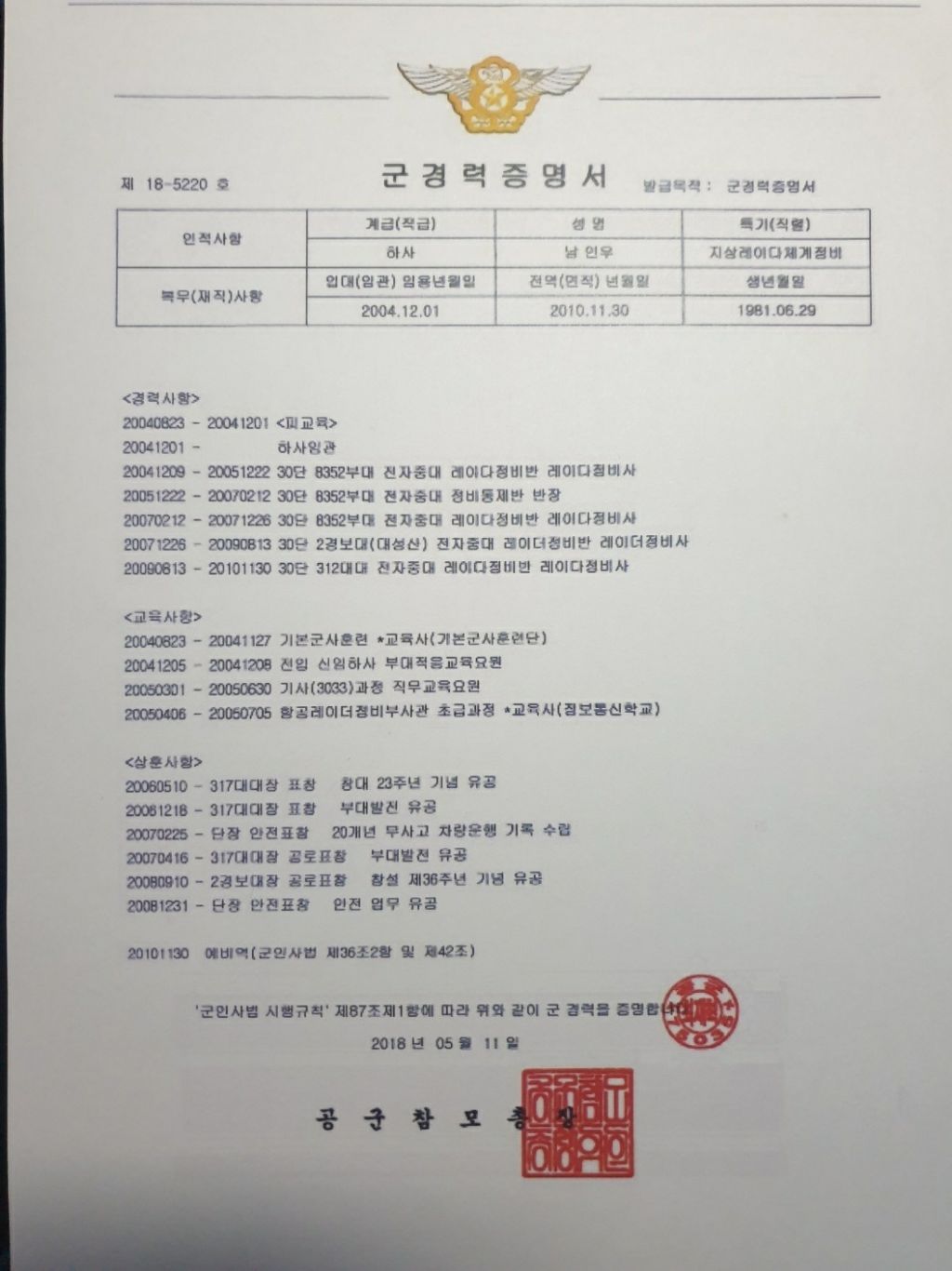 공군본부에서 국가1급비밀 작전레이더 통제반장으로 7년6개월 복무중 미국핵미사일 레이더 소프트웨어를 훔친 간첩100명 신고, 하나회 2만명 강제전역시킨후 부당해임당했고, 1달뒤 연평도해전 터졌다. 이명박을 구속시켜라.