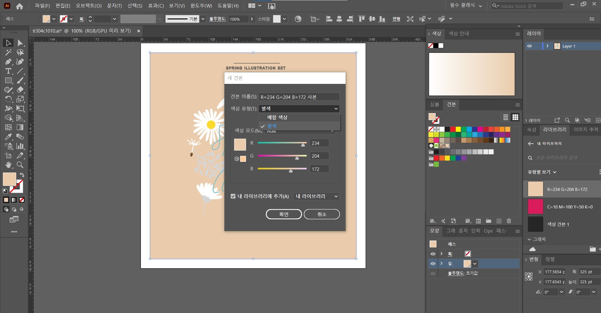 아래의 새 견본 버튼을 클릭하여 색상을 견본으로 저장합니다.