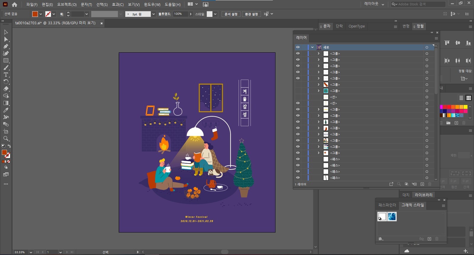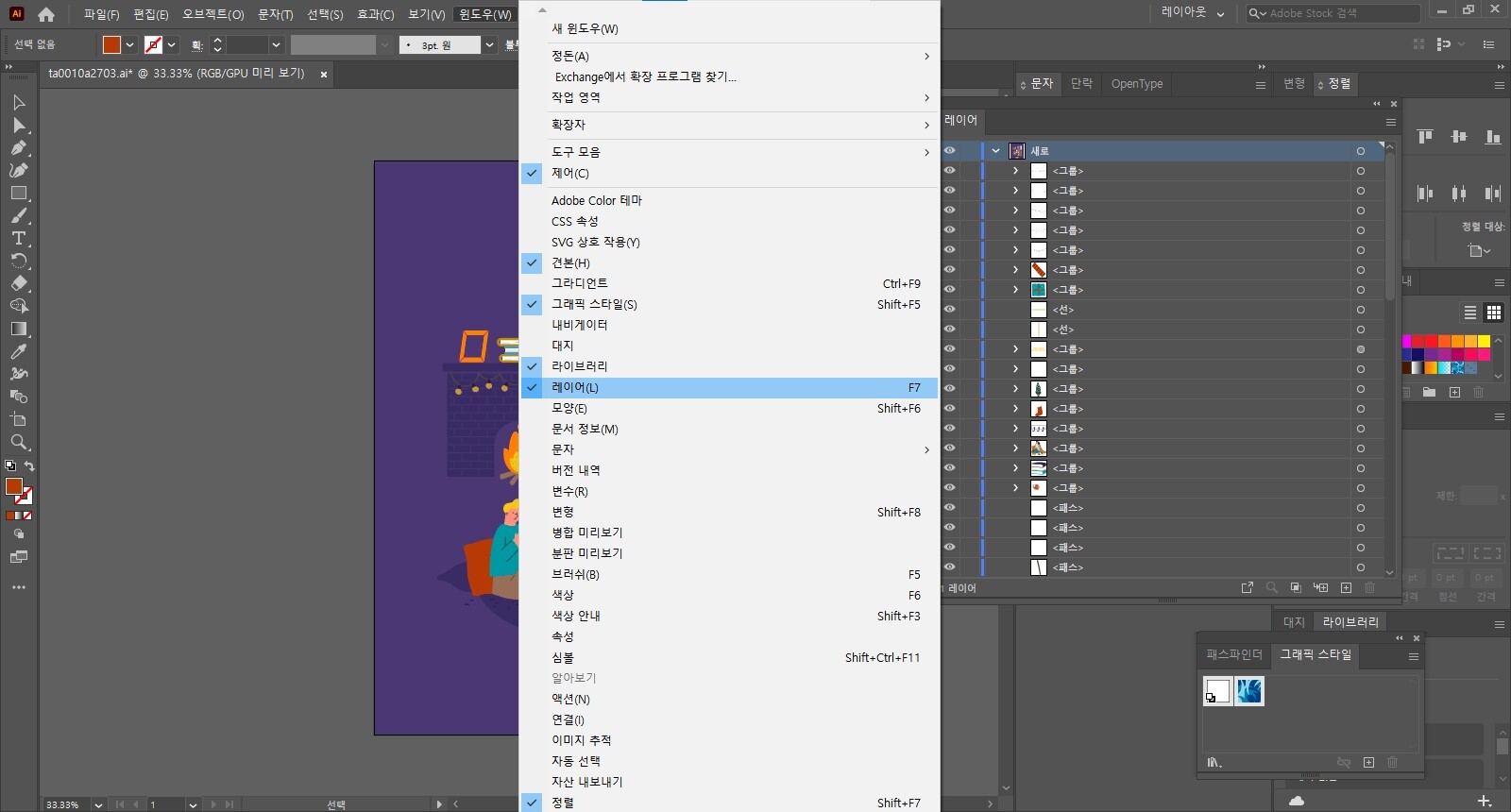 먼저 레이어 패널(윈도우 > 레이어)에서 문서의 레이어를 찾습니다.레이어에는