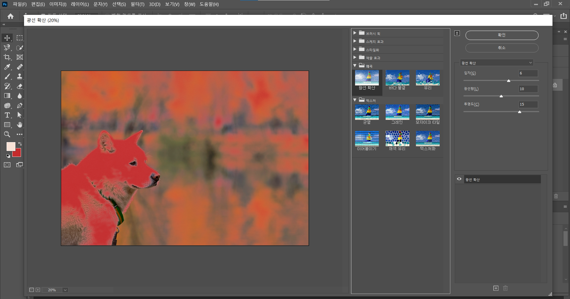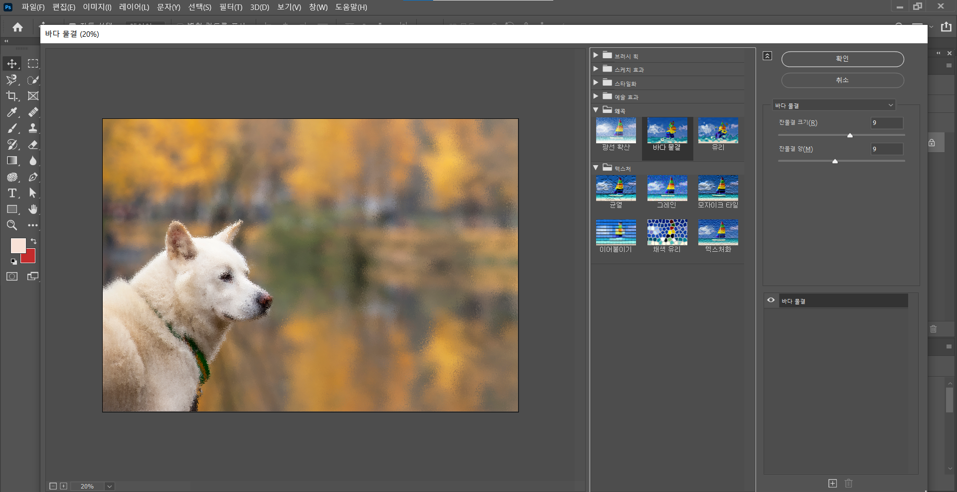 필터 효과는 포토샵의 필터 칸의 필터 캘러리 칸으로 들어가시면