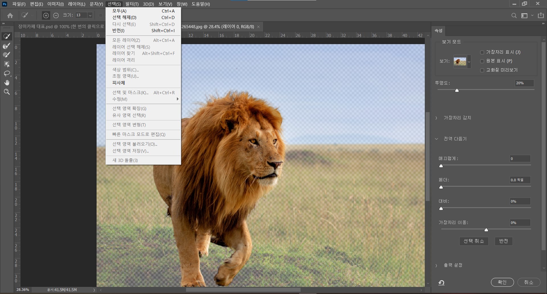 선택 영역을 세밀하게 조정하려면 선택 > 선택 및 마스크를 선택하여 선택 및 마스크