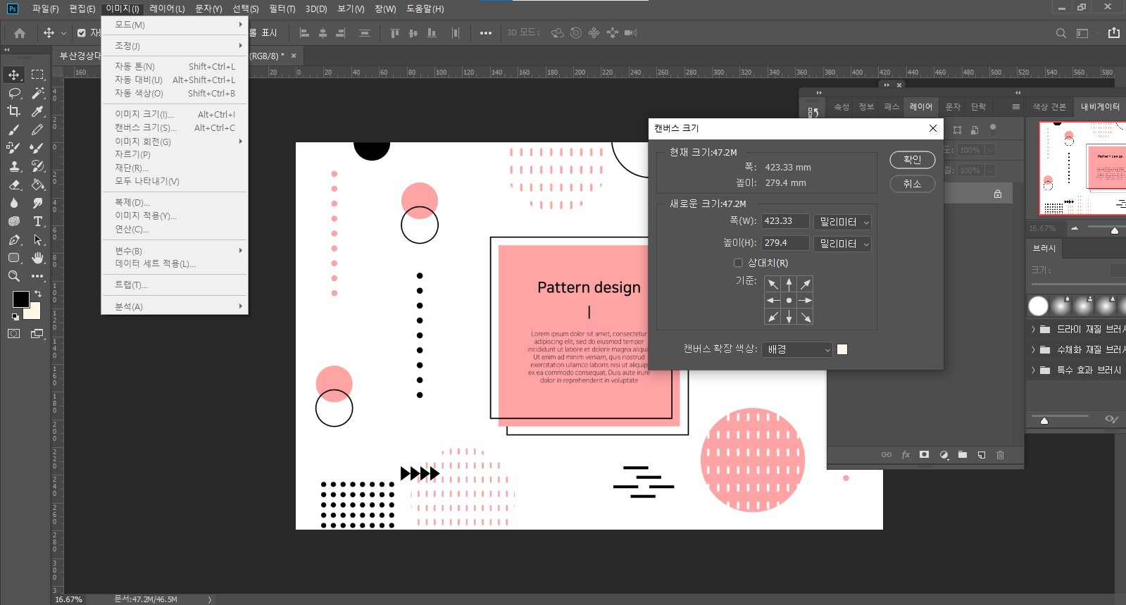 이미지 > 캔버스 크기를 선택합니다.캔버스를 추가하려면 추가할 폭과 높이의 수치를 입력합니다.