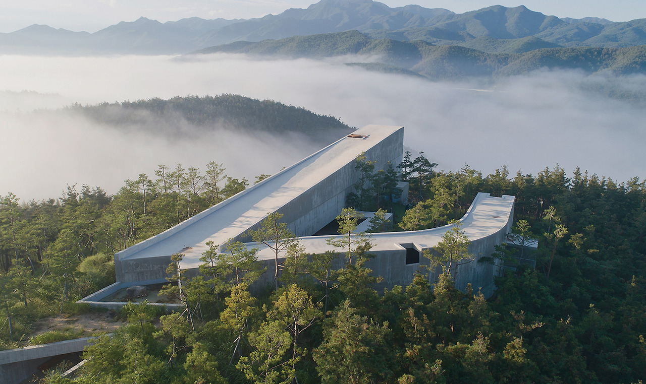 | 승효상이 설계한 '마음 전망대'가 있는 곳 유 회장은 오랜 인연이 있는 승효상 건축가와 수목원의 개념부터 상의했다. 땅을 둘러본 승효상은 감탄했다. 고립무원의 땅이었다. 남으로 팔공산, 북으로 도봉산 등 하늘 아래 보이는 것이라고는 자연 밖에 없었다. “성찰하고 사유할 수 있는 수목원을 만들자”고 두 사람은 의기투합했고, 그 자리에서 ‘사유원’이라 이름 지었다. 승효상은 “이름이 정해지니 수목원의 성격과 갈 길이 명확해졌다”고 소회했다. 자연과 관계 맺으며 생각할 수 있는 공간을 만들되, 형태가 드러나지 않게 파묻고 감추기로 했다. 현암의 모습. 사유원 내 공간들은 존재감을 지우려 애썼다. [사진 김종오 작가]현암의 내부 모습. 삼면 유리창을 통해 파노라마 뷰가 펼쳐진다. 권혁재 사진전문기자 2014년 첫 공간인 ‘현암’(玄庵)이 완공됐다. 수목원에 모과나무를 이식한 유 회장이 이를 관찰하기 위해 머물 장소가 필요해 만든 집이었다. 산맥이 땅을 따라 흐르다 푹 떨어지는 혈 자리에 매달린 듯 자리 잡은 암자를 지었다. 복층 구조로 위는 삼면이 유리라 뻥 뚫린 정자 같은 공간이고, 그 아래 8㎡가량 되는 잠 잘 방을 뒀다. 별 볼 일 없는 집이라 명명했지만 들어서면 감탄사가 절로 나온다. 장대한 자연이 눈앞에 펼쳐져서다. 승효상은 “집이 서향에 위치해 동지 때 일몰되는 축으로 맞췄고, 그때 되면 해가 정확히 집안으로 꽂히는 모습이 장관”이라고 설명했다. 이어 하나둘씩 공간이 만들어졌다. 연못 옆에 공연할 수 있는 공간인 ‘사담’, 물탱크를 감추기 위해 별을 볼 수 있는 제단 같은 구조물인 ‘첨단’, 3개의 연못 옆에 걸치듯 누워 있는 쉼터 ‘와사’가 들어섰다. 수목원 전체를 조망할 수 있는 전망대를 원하는 유 회장의 뜻에 따라, 건축가는 전망대도 만들었다. 그 런데 땅속에 파묻었다. 청개구리 같은 작업의 이유는 분명했다. 승효상은 “전망대까지 오는 동안 대단히 아름다운 경치를 봤을 테고, 이를 마음속으로 정리한 뒤 다시 자연 속으로 나설 공간이 필요하다고 생각했다”고 말했다. 사유원의 마음 전망대 '명정'의 모습. 승효상 건축가는 전망대를 땅 속에 파묻었다. 그렇게 사유원만의 마음 전망대 ‘명정’이 만들어졌다. 계단을 따라 땅속으로 걸어 들어가면 돌의 공간이 나온다. 안에는 촛불 켜고 기도할 수 있는 성소가 곳곳에 있다. 풀 한 포기 보이지 않는 땅속에서 마음을 살피고 나오면 푸른 수목원이 눈 앞에 펼쳐진다. 수목원에는 포르투칼 건축가 알바로 시자가 명상을 위해 만든 건축물도 있다. 건축계 노벨상이라 불리는 프리츠커 상을 받은 이로, 파주 출판도시의 ‘미메시스 아트뮤지엄’을 설계했다. 수목원 내 자연도 솎아내는 간벌 작업과 무수한 심기를 거쳐 이제 관리 단계로 접어들 때가 됐다. 여기까지 오는 데 15년이 걸렸다. 풍경을 찬탄하기 위한 최소한의 건축, 사유원 경상북도 군위군에 300년 이상된 모과나무 108그루가 사유(思惟)하고 있는 수목원이 있다. 언덕을 따라 도열한 나무의 모습이 마치 호령하는 산신령 같다. 굵직하게 뒤틀린 모습이 기기괴괴하다. 한 그루의 나무에 여러 나무의 생명력이 합쳐진 결과다. 분재용으로 오랫동안 연리지를 거쳤고, 여러 그루가 하나로 합쳐지고 또 합쳐져서 2m가 넘는 굵기가 되기도 했다. 수목원의 크기는 축구장 약 45개 규모다. 네 시간을 꼬박 걸어야 다 돌아볼 수 있지만, 어쩌면 무한한 시간이 필요한 곳이다. 수목원 안에는 자연과 더불어 생각하길 권하는 공간이 많다. 이 공간을 만들기 위해 건축가 승효상ㆍ알바로 시자, 조경가 정영선ㆍ카와기시 마츠노부 등 당대 걸출한 명인들이 모였고, 15년째 다듬어 가고 있다. 유례없는 조성 기간과 규모, 독특한 공간까지 더해져 “전 세계에서 유일무이한 수목원”이라고 거침없이 명명되는 수목원의 이름은 사유원(思惟園)이다. 장재영님 한은화 기자 글에서..발췌 리산애 세계여행 여행신청 문의 010-9255-8965 리산대표 |