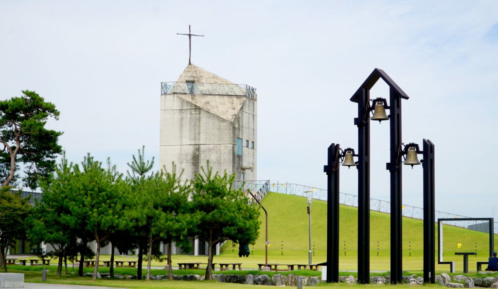푸른 잔디밭이 완만하게 경사를 이루며 조성돼 있고, 그 중심에 유럽의 요새처럼 생긴 교회, 동네 앞산의 나뭇가지를 엮어놓은 듯한 십자가가 황금빛으로 물든 예당 평야를 굽어 살피고 있다. 그냥 한폭의 그림이다. 프랑스에 있던 2층집 높이의 삼위일체형 종을 세워둔 모습도 아름답다.