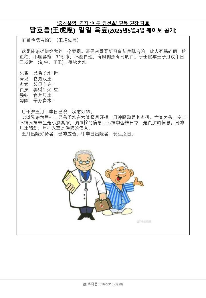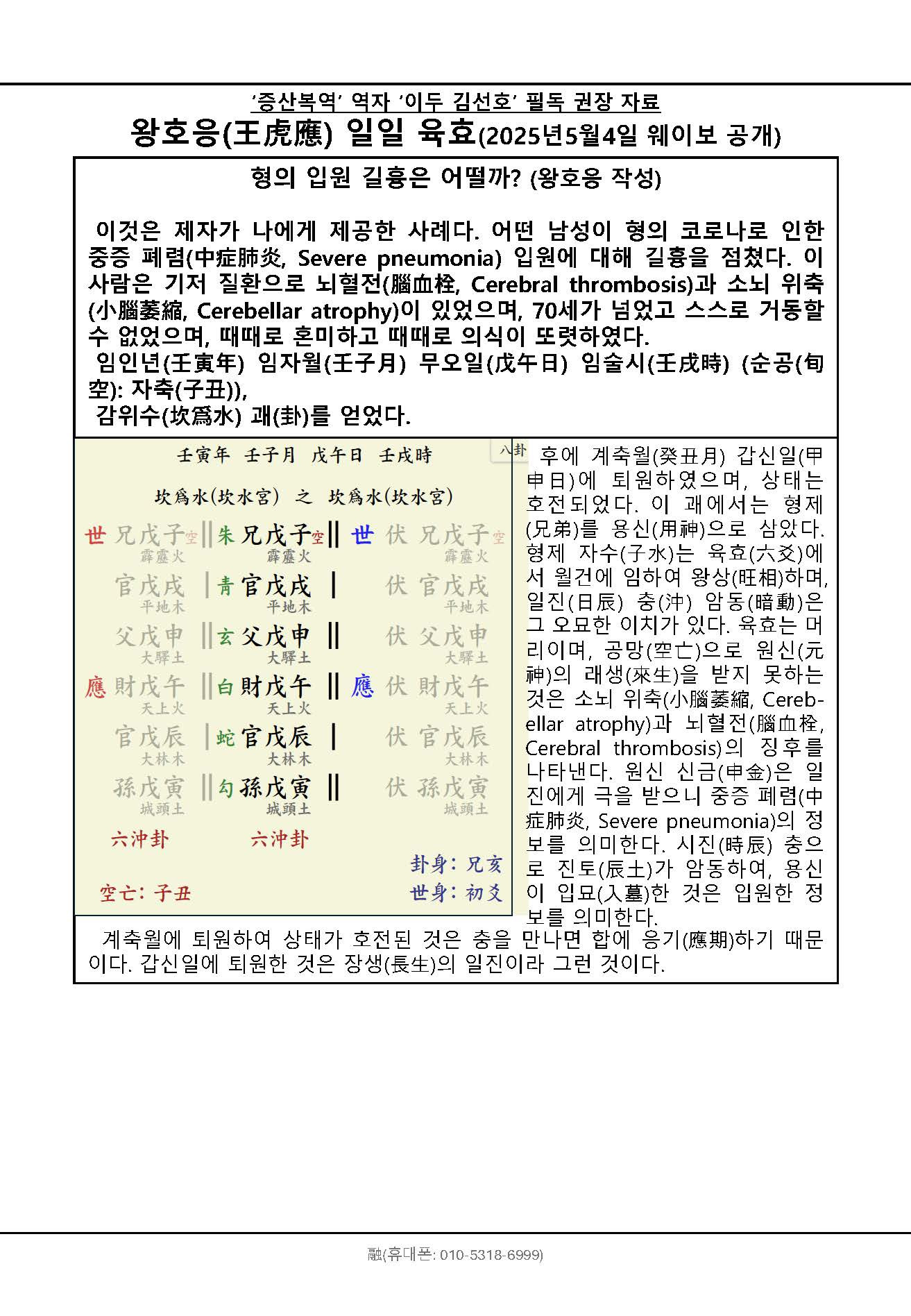 오늘은 병점입니다. 주괘가 감수궁이니 수는 지혜를 나타낸다. 용신이 육효에서 자수 공망으로 주작에 임하므로 원신의 생을 받지 못하며, 육효는 머리이고 주작은 언어를 나타내어 뇌질환이 있으면서 말도 어눌할 듯 합니다. 시진(時辰)의 암동으로 입원을 예측하는 것도 눈여겨봐야 하겠네요~^^