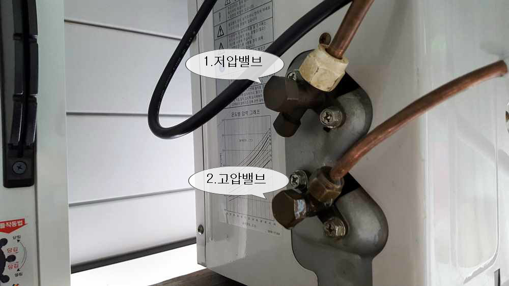고압을 렌치로 몇초 열어서 냉매주입하고 다시잠그고,