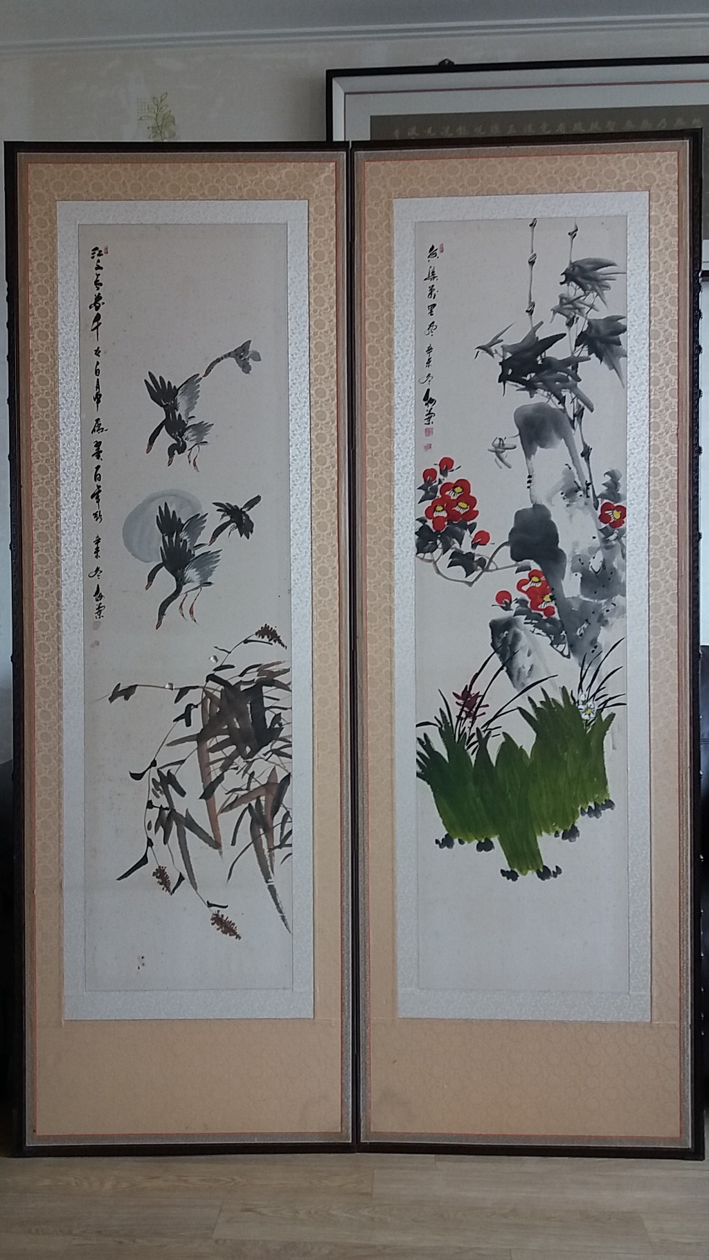 1. 새와 산수화가 그려진 두폭 병풍 (세로 1.6m, 가로 1.1m)