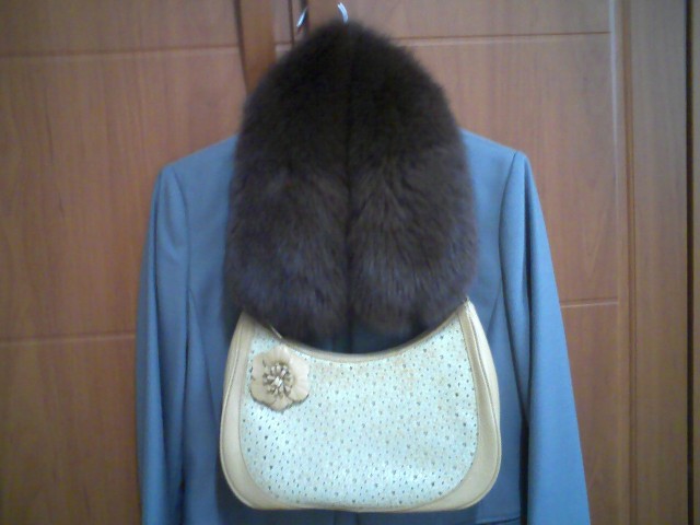핸드백은 노르스름한 색이고 털은 연갈색 입니다
