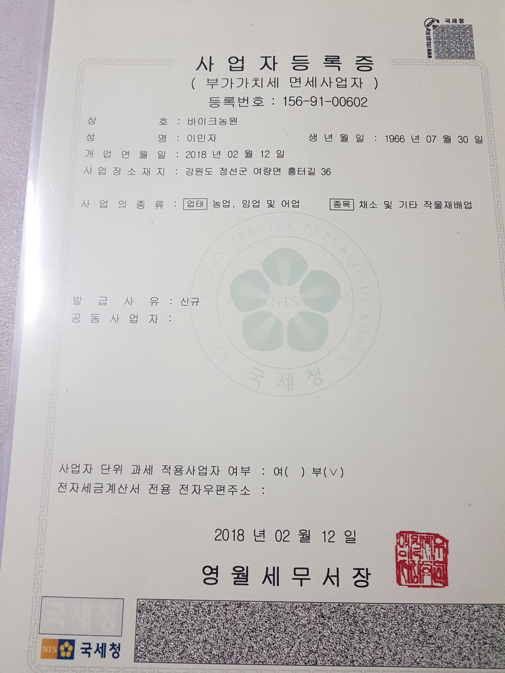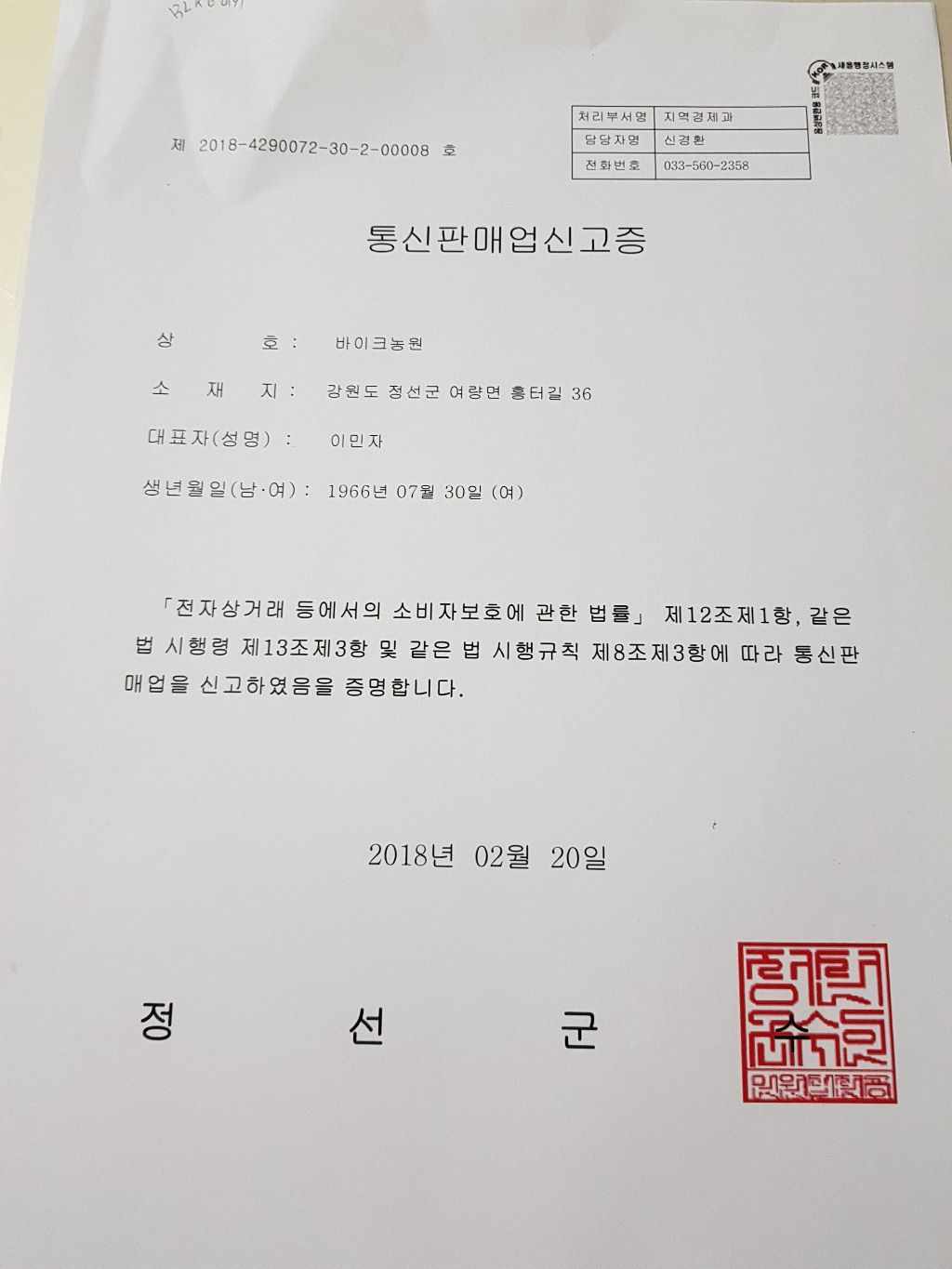 농장(공장)주소(번지까지 기재) :강원특별자치도 정선군 여량면 곰바리길142