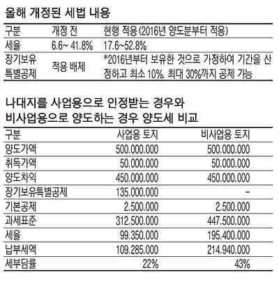 직접 농사 안짓는 땅, 양도세 크게 는다-일반세율(6.6~41.8%)에 10% 포인트가 가산된 세율로 양도소득세를 납부해야