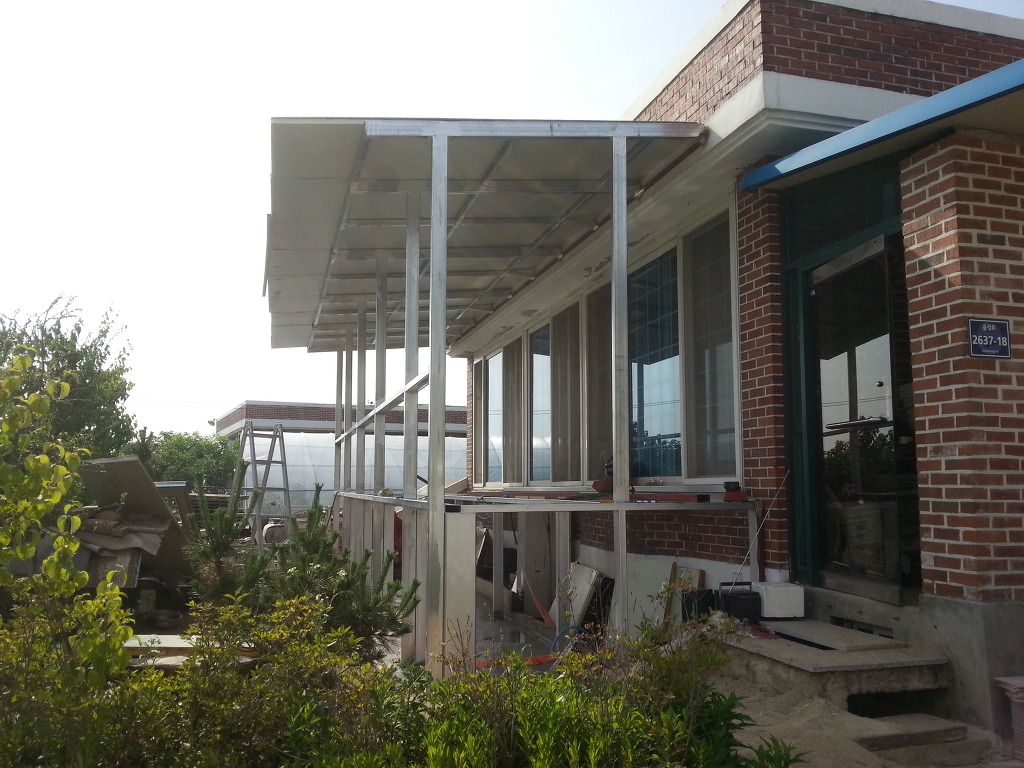 지붕은 유리보다는 아크릴판으로 하면 좋을것같네요. 모양은 위로 약간 둥글게 휘어지게하면 평면보다는 훨씬 우박이나 돌발사태에 강해지고 오래갑니다.
