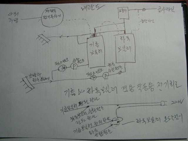 #화목보일러 온도조절기엔 3단자가 있는데 공통단자에 전기 한선이 들어가면 한쪽단자엔 기름보일러 전원선이 한가닥연결되고 한쪽단자엔 화목보일러 순환펌프한선이 연결되는데 화목온도조절기를 제일 낮은온도로 했을때 화목순환펌프가 돌아가고 기름보일러는 꺼지게 연결하시면 됩니다.전기모르신분도 이해가시게 쉽게 그림그렸으니 참고 하세요.저희는 기름은 귀뚜/둥지화목보일러를 사용하는데(싼맛에)저녁엔 45도정도 맞춰놓고 나무를 넣어두면 외부온도나 나무나 양에 따라 차이는 있지만 새벽 4시-7시정도에 기름보일러(실내온도는 님들사용온도로 맞춰두세요)가 돌아 가더군요.낮엔 집에 노모가 계셔서 화목용온도를 35도정도에 설정해 둡니다.작동원리는 화목보일러에 설정해둔 온도보다 온도가 낮을경우 기름보일러에 전원이 들어가 기름보일러 실내온도 조절기에 설정된 온도만큼 기름보일러가 작동됨