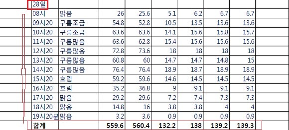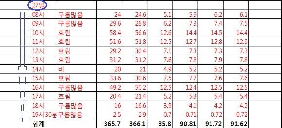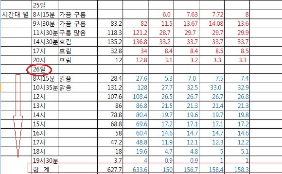 위 표는 기간이 짧고 맑은 날보다 흐린 날이 많아 통계나 확률로서의 의미는 미미한데요.