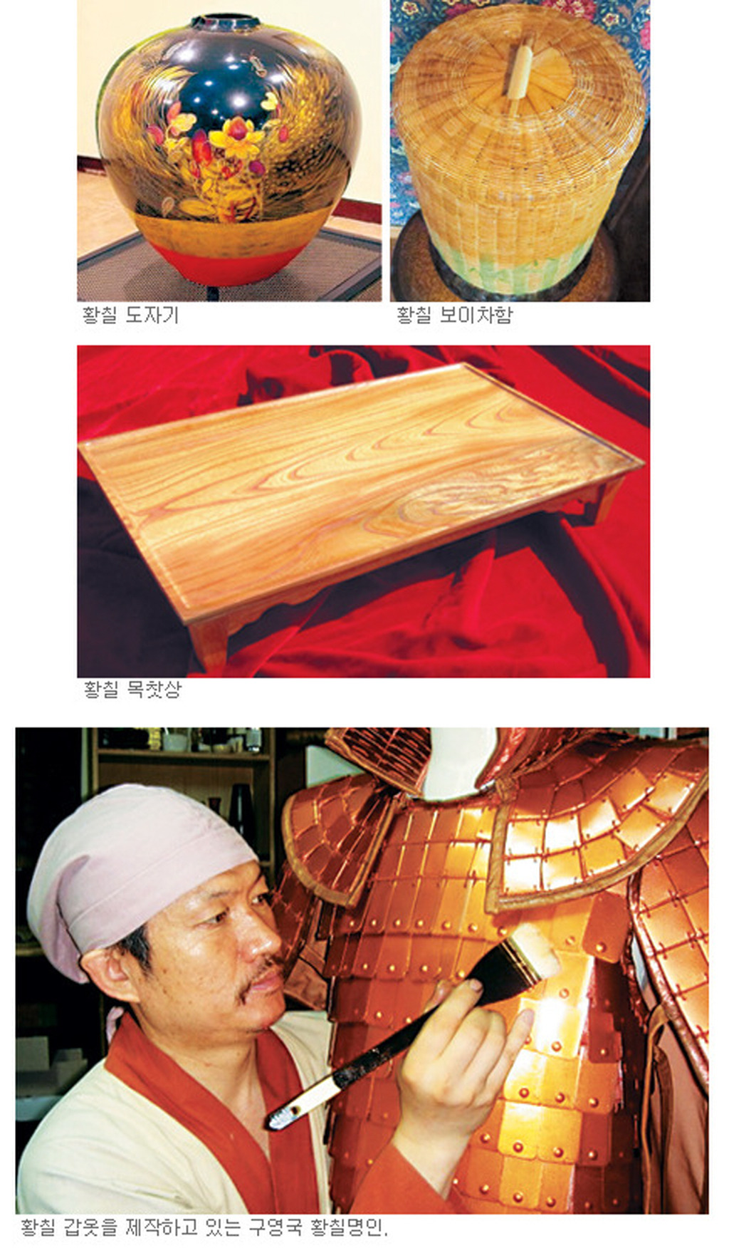 나전-황칠-옻칠-전통공예 디자인의 네가지를 한꺼번에 하는 기능장은 구영국교수가 국내 유일로 알려진다.은은한 황금색에 내열 내수 내구성이 강한 황칠은 고대로부터 공예품의 표면을 장식하는 데 쓰였다.