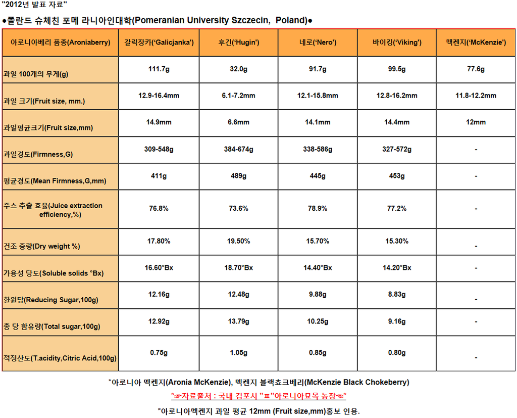 아로니아베리 6품종 평가 성능시험 결과