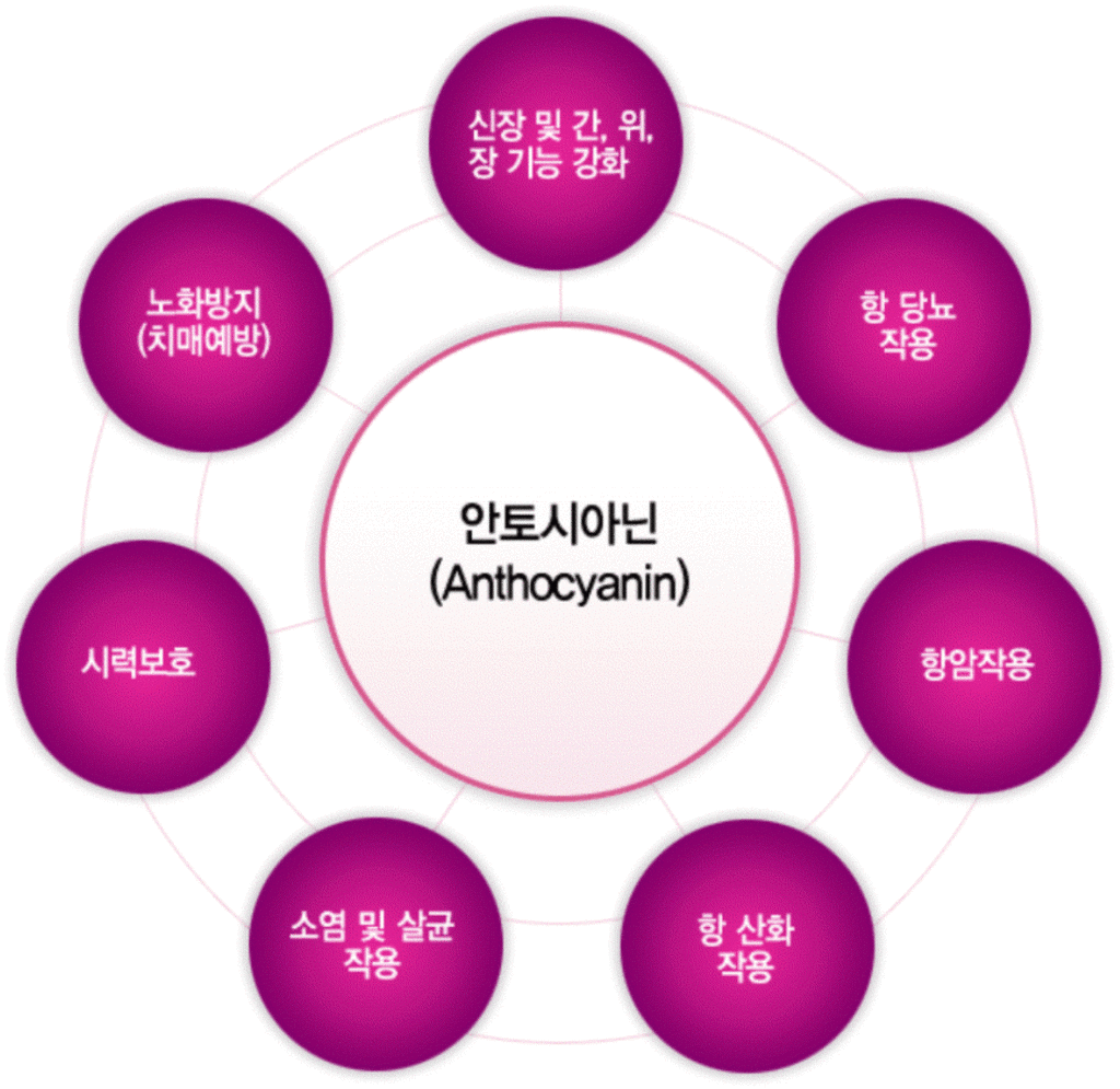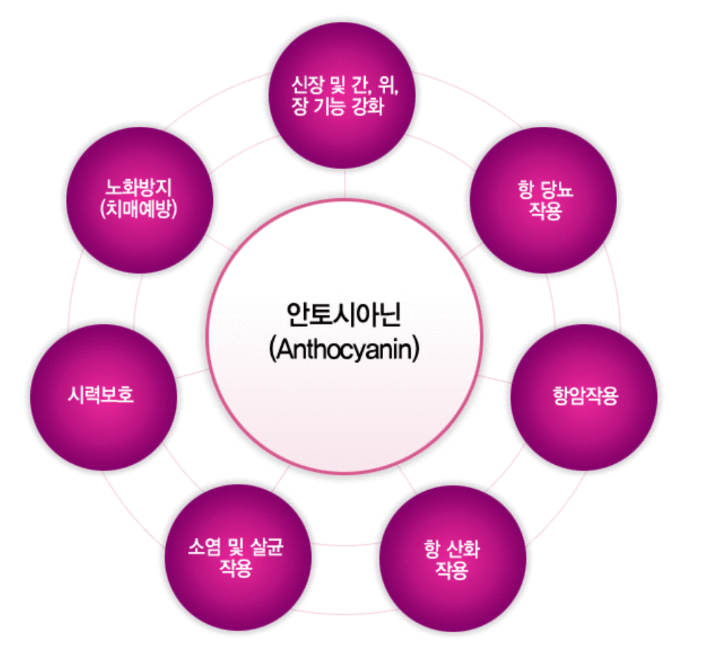 한국은 폴란드, 그 어느나라들 보다도 기후가 변화무쌍 최악조건이기 때문에 고함량(高含量)의 항산화물질(抗酸化物質)인 파이토케미컬(Phytochemicals)을 다량으로 식물체내에 생성 축적시킨다. 프로안토시아니딘 또는 응축된 탄닌(Condensed tannins)로 불리우기도 하며 비타민 C의 20배, 비타민 E의 50배 항산화효과가 있는 것으로 알려져 있다. 프로안토시아니딘(Proanthocyanidin)은 플라보노이드(Flavonid)계열의 플라바놀(Flavanols)배당체이다. 프로안토시아니딘은 동맥에 침전물이 생기는 것을 막아 피를 맑게 하며 심장 질환과 뇌졸중 위험을 감소시킨다. 또한 강력한 항산화 작용과 노화방지 기능을 가진 플라보노이드(Flavonid)의 안토시아닌(Anthocyanidin)은 강력한 소염작용과 고혈압, 심장병예방, 암예방 등의 효능이 밝혀지면서 건강물질로 각광받고 있다. 또 강력한 항산화 작용을 가지고 있을 뿐 아니라 피부세포를 외부 유해환경으로부터 보호하는 효과가 탁월하다.