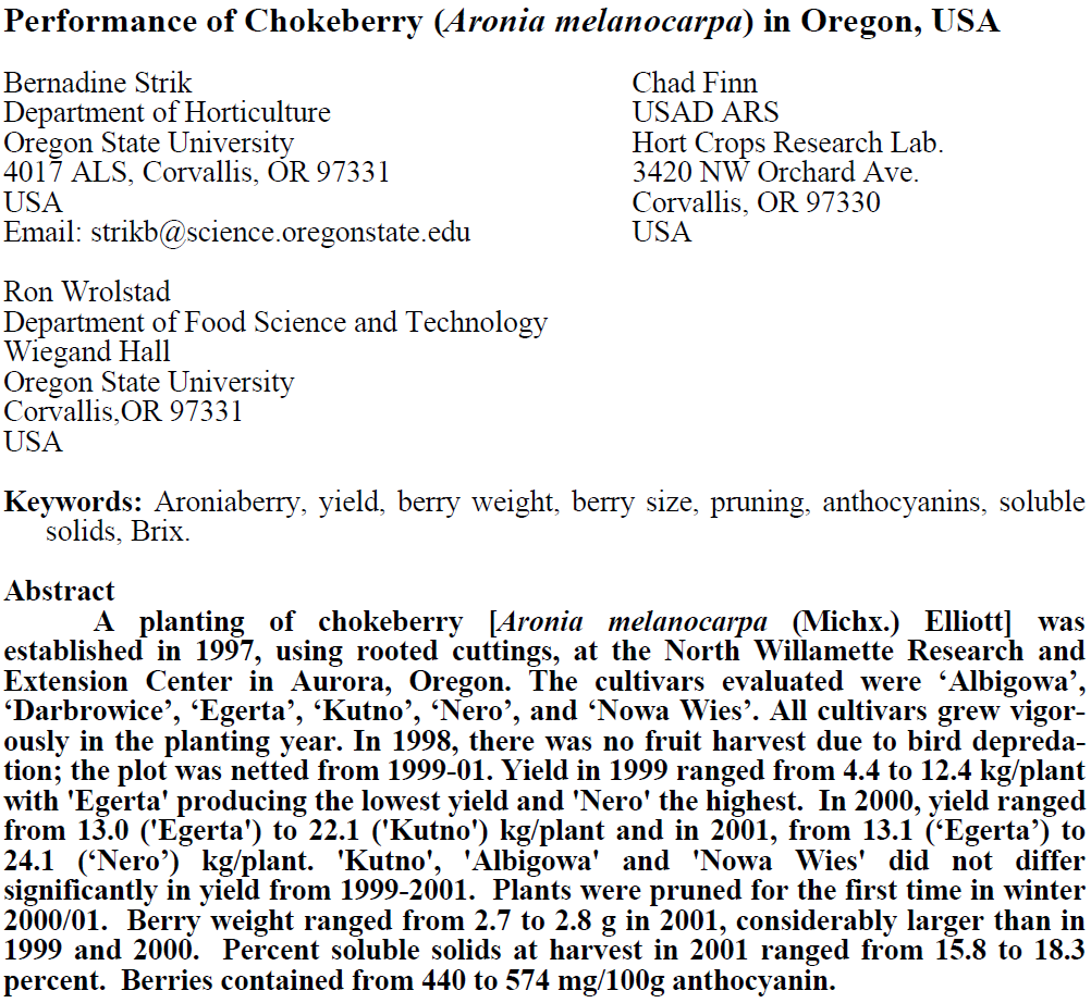 Performance of Chokeberry (Aronia melanocarpa) in Oregon, USA