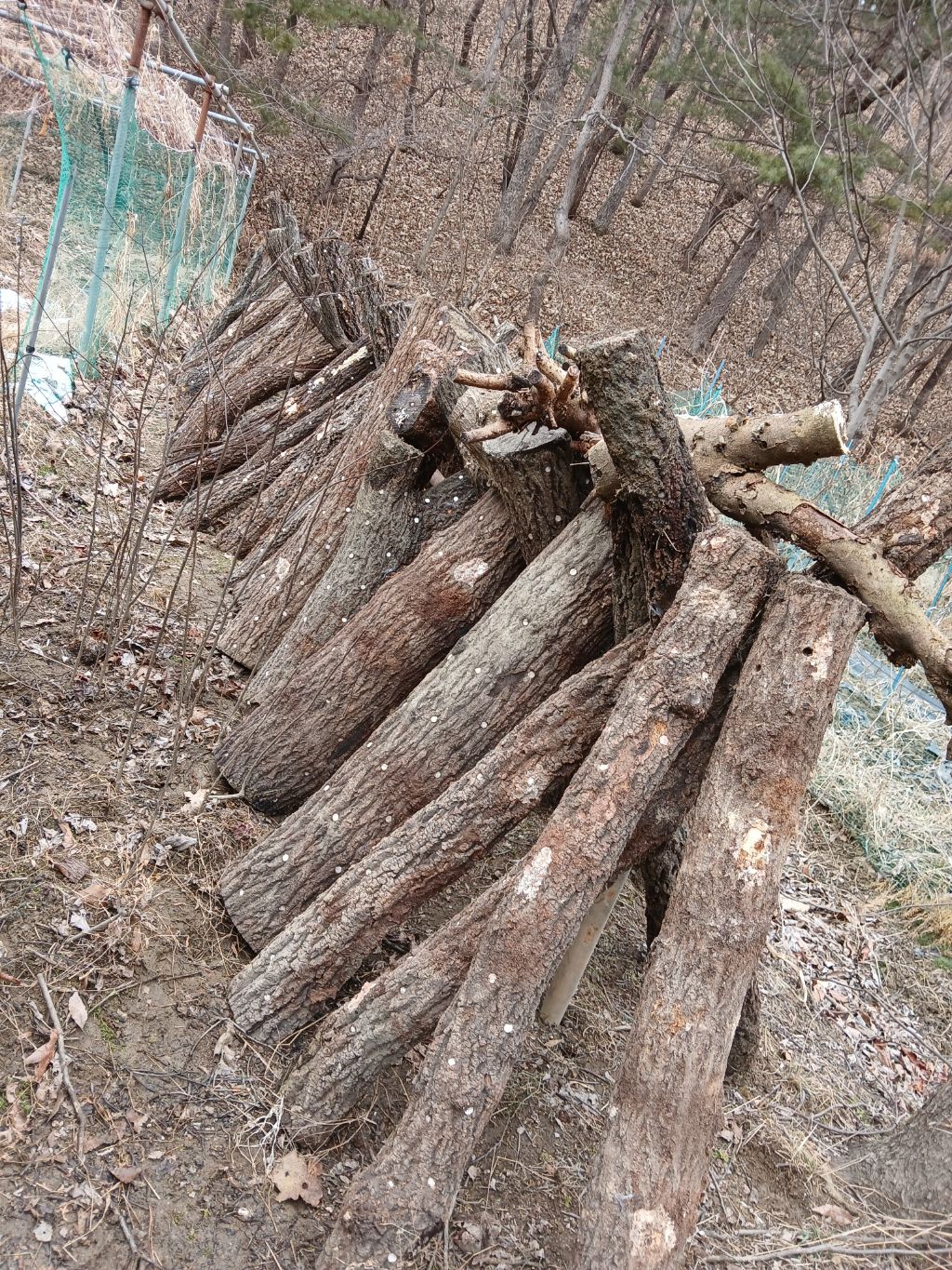 지난가을에 세워놓지 못하고 이제서야 버섯목을 세워놓았는데 잘나와 달라는 마음을 담아서 물주고 다독거리면 자급자족 양식은 되겠지요