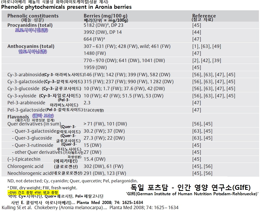 아로니아베리 페놀의 파이토케미컬성분 제시 Phenolic phytochemicals present in Aronia berries •DW: 건조 중량 •FW: 생과 중량