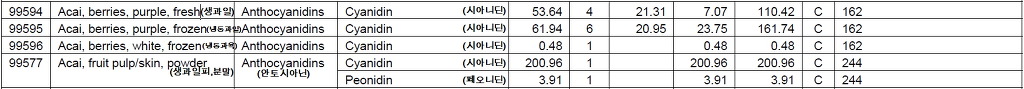 • 생과일 안토시아닌 평균치 계: 53.64mg, 최대치 계 110.42mg • 냉동과일 안토시아닌 평균치 계: 61.94mg, 최대치계 161.74mg • 냉동과육 안토시아닌 평균치 계: 0.48mg, 최대치계 0.48mg • 건조과일피,분말 안토시아닌 평균치 합계: 204.87mg, 최대치 합계 204.87mg * 아사이베리의 위 각각의 안토시아닌 수치 *