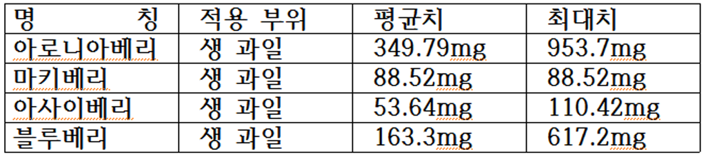 • 생과일 안토시아닌 평균치 합계: 163.3mg, 최대치 합계 617.2mg