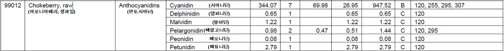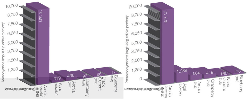 아로니아 생과 안토시아닌(Anthocyanins ) & 프로안토시아니딘(Proanthocyanins) 성분차트
