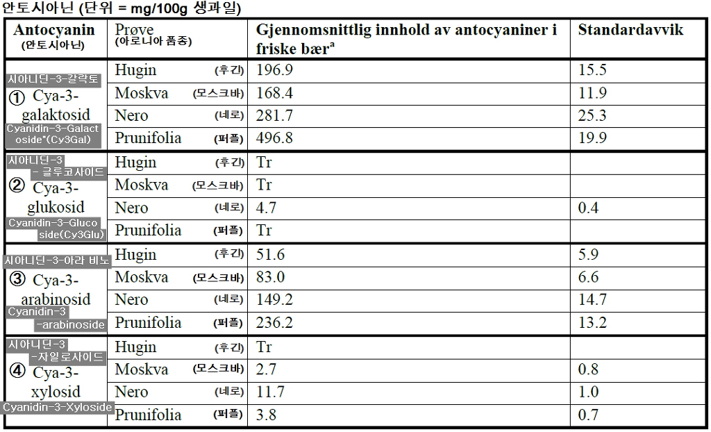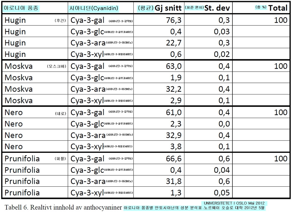 노르웨이 오슬로 대학 2012년 5월(UNIVERSITETET I OSLO Mai 2012) 아로니아 품종별 안토시아닌의 성분 분석표