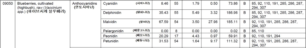 블루베리(하이부시계)의 안토시아닌 성분함량