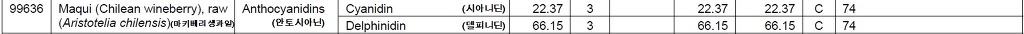 2.안토시아닌(총)(Anthocyanins) 1,480mg (FW), 1,959mg (DW) ⓐCy-3-아라비노사이드(Cy-3-arabinoside) 399 (FW), 582 (DW) ⓑCy-3-갈락토사이드(Cy-3-galactoside) 990 (FW), 1,282 (DW)
