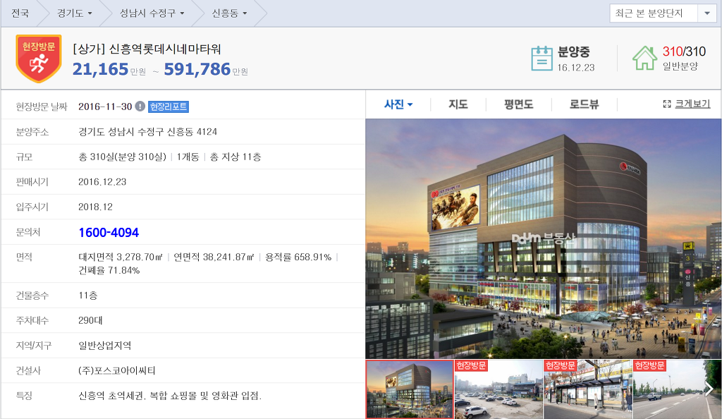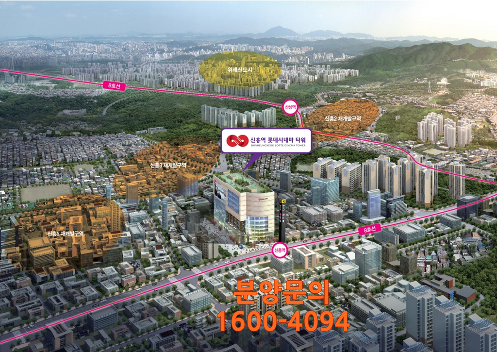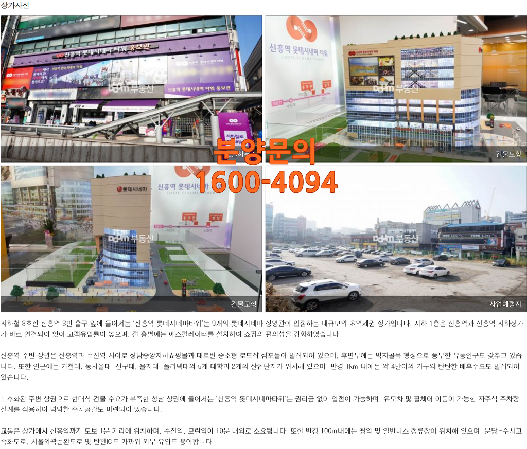 성남 신흥역 롯데시네마타워는 2018년 12월 준공을 목표로 현재 공사진행중에 있습니다. 지하철과 직통으로 연결이 되고 전층 에스컬레이터로 이동이 가능해요. 롯데시네마 영화관 9개관이 입점을 합니다. 지하1층은 옷가게 의류매장 핸드폰매장 매점등이 가능하고 지상1층은 독점약국자리 2개호 준비되어 있어요. 지상2층~4층은 판매시설로 미용실, 네일아트 키즈카페 프랜차이즈 음식점 노래방 선술집등 지상5층과 6층은 메디컬센터로 병원상가입니다. 각종 병원 입점가능해요 지상7층은 푸드코트로 영화관 바로 아래층입니다. 에스컬레이터로 이동이 가능하여 관람객들이 식사할 수 있는 곳입니다. 신흥역 롯데시네마타워 상가분양 문의 많이 연락주세요 임대수익율 대출 60% 10.5% 나오는 상가입니다. 초역세권 상가 구하시기 힘들어요!