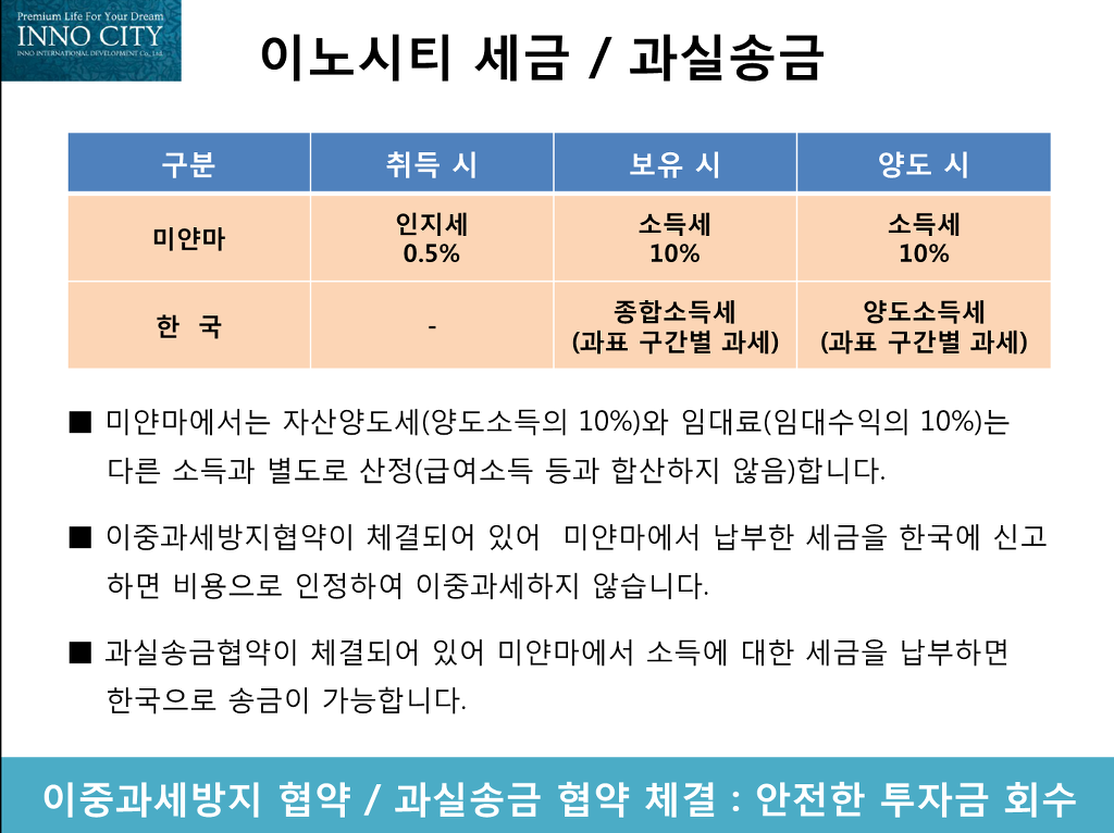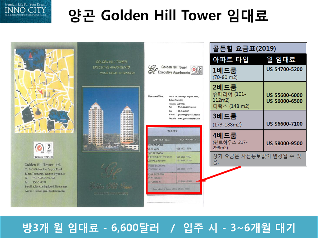 임대 수입료는 계약기간에 따라 보통 1년으로 합니다. 1년치 임대료 미얀마에서 10프로 세금내고 나머진 한국 씨티 은행 또는 신한은행에서 입금 받으실수 있습니다.