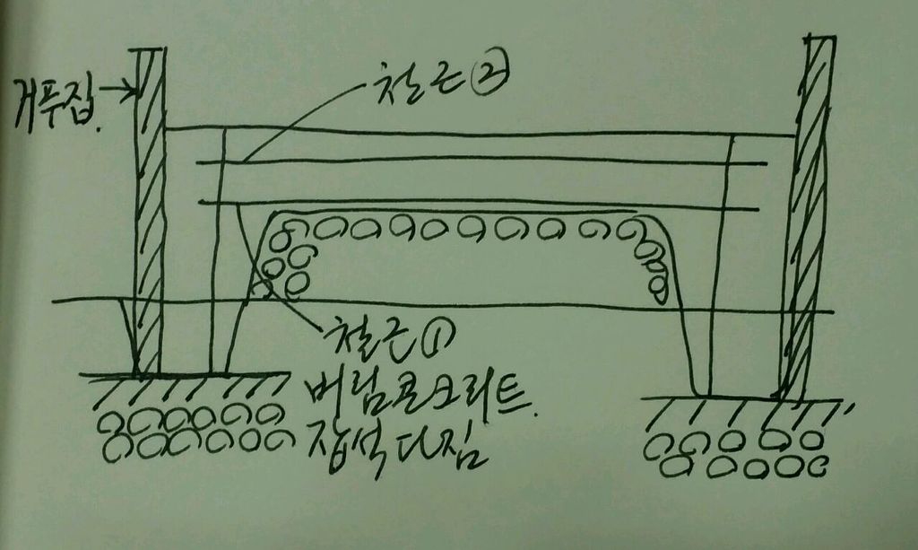 작성자애수리 작성시간 16.05.04 철근은 철근콘크리트에 인장력을 보강하는겁니다. 쉽게말해서 압축만 받을때는 그의미가 없죠 ,, 그림이 자세히는 모르겠으나 간격20센티정도면 될듯 주철근과 보조철근이 있는데 휘어지는 부분은 좀더 신경쓰시길..