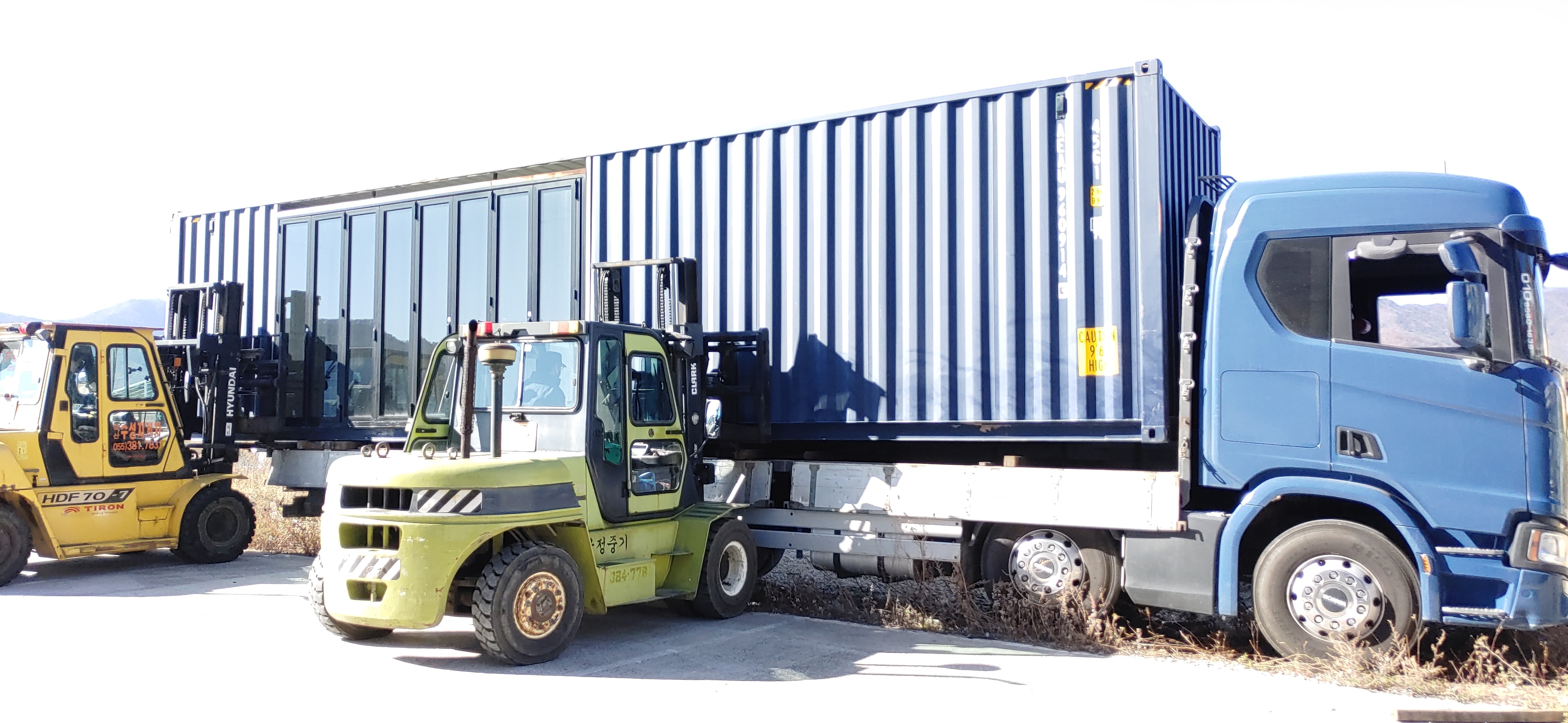 3 × 9 연동형 컨테이너 ㅡ 2대 분리 후 상차중. 측면개방형. 창고 활용시 제품 반출입이 편리함