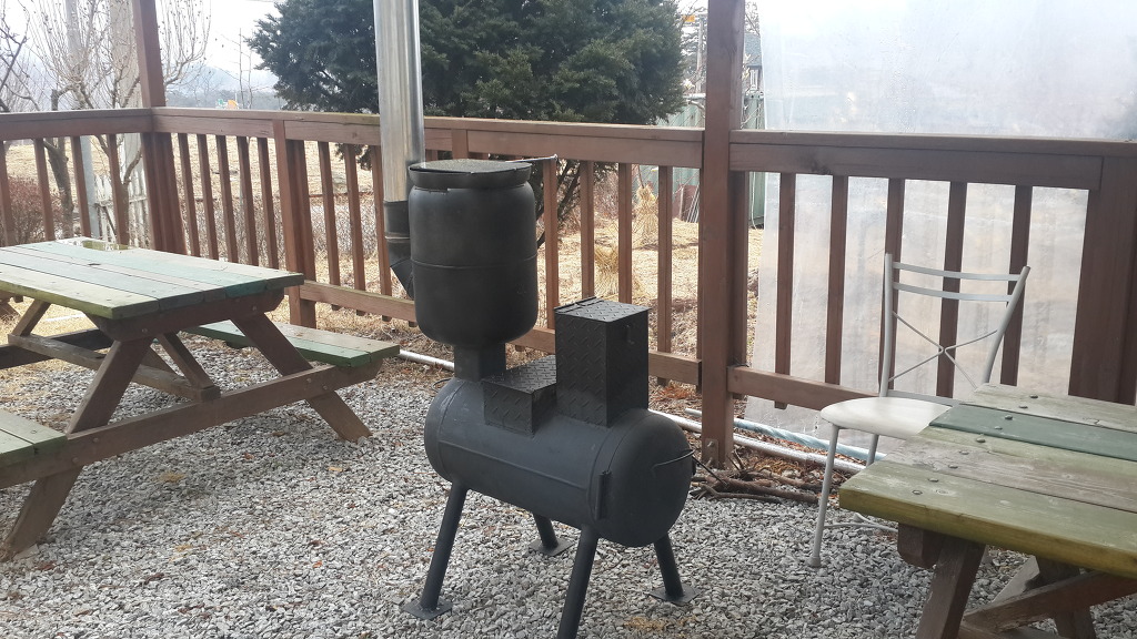 아래 사진은 식당 야외휴게실에 난로를 설치한 모습입니다.