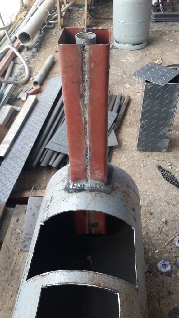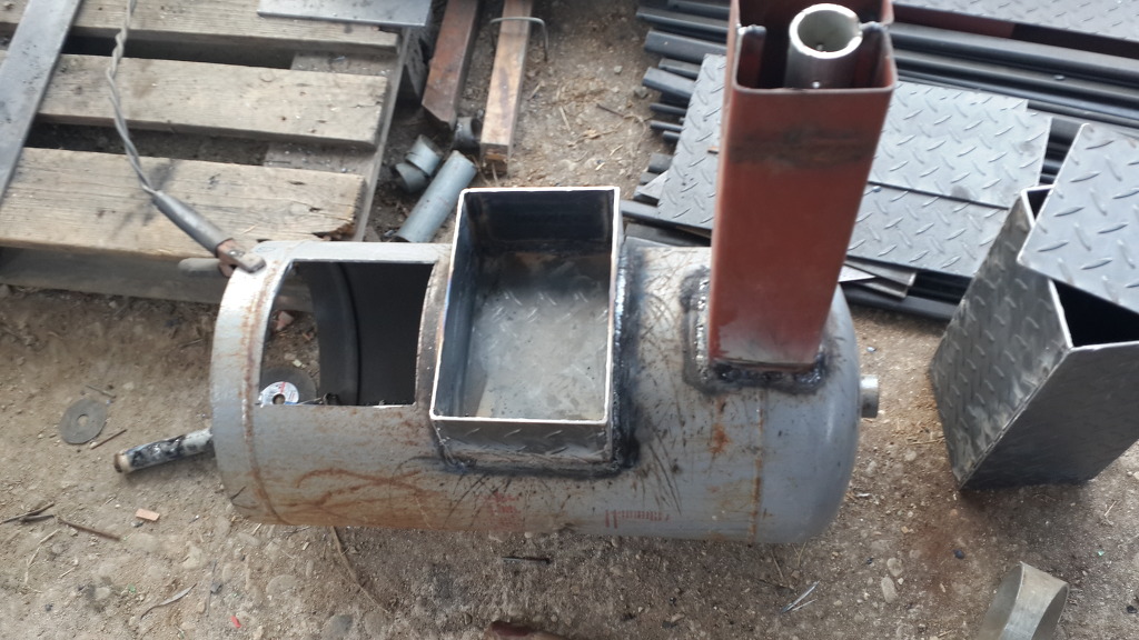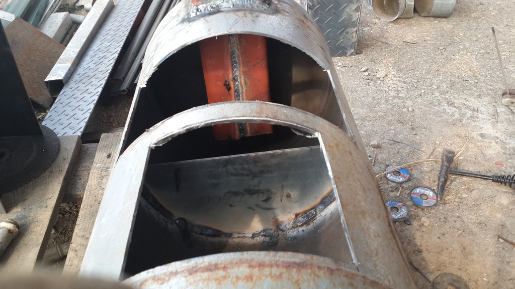 위쪽 사진처럼 시간 나는대로 얻어온 철판으로 도면대로 절단해서 준비를 해 놨습니다. 2차 연소실 급기 파이프는 하우스 짓고 남은 파이프고, 배기구로 쓸 '기역'자 연통꽂이는 1만원 주고 고물상에서 사다가 각도 계산해서 어슷하게 잘라놨고, 2차연소실로 올라가는 파이프는 마땅한게 없어서 집 공사하고 남은 100밀리 C형강 2개를 마주 포개어 용접해서 준비했지요 ㅠ