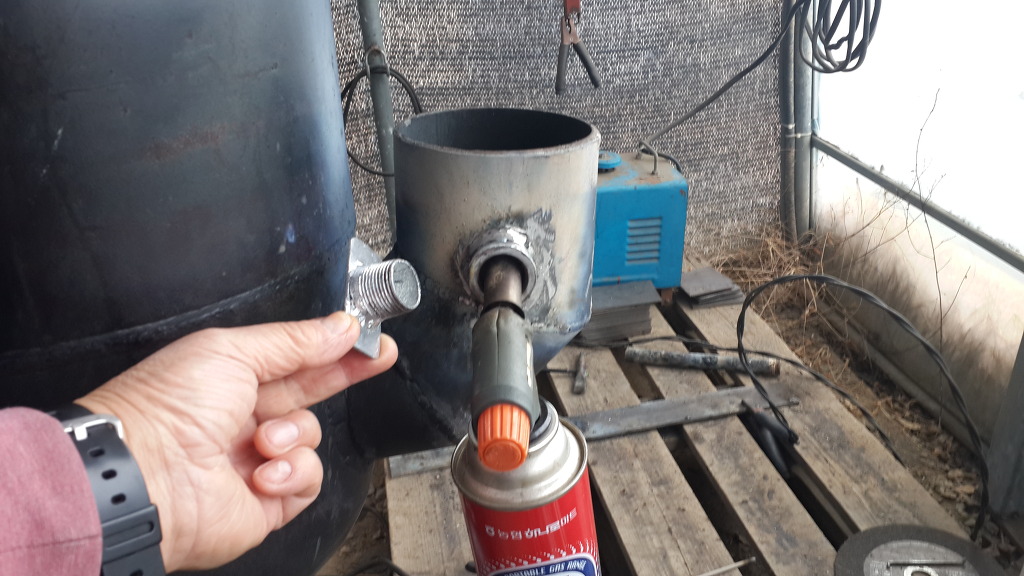 이렇게 완성해서 점화시험 해 보니 90% 만족도라고 나름 평가 하였는데, 아직 익숙하지 않아서인지 점화시간이 많이 걸리는게 성에 차지 않더군요ㅠㅠ 연통이 데워져야 배기력이 생겨 정상 운전되는 원리이기에 위 사진처럼 만들어 토치 하나를 꽂아놓고 다른 토치로 점화하니 쉽게 점화할 수 있었습니다. 정상운전 시작하면 구멍을 막으면 되고요.ㅎㅎ