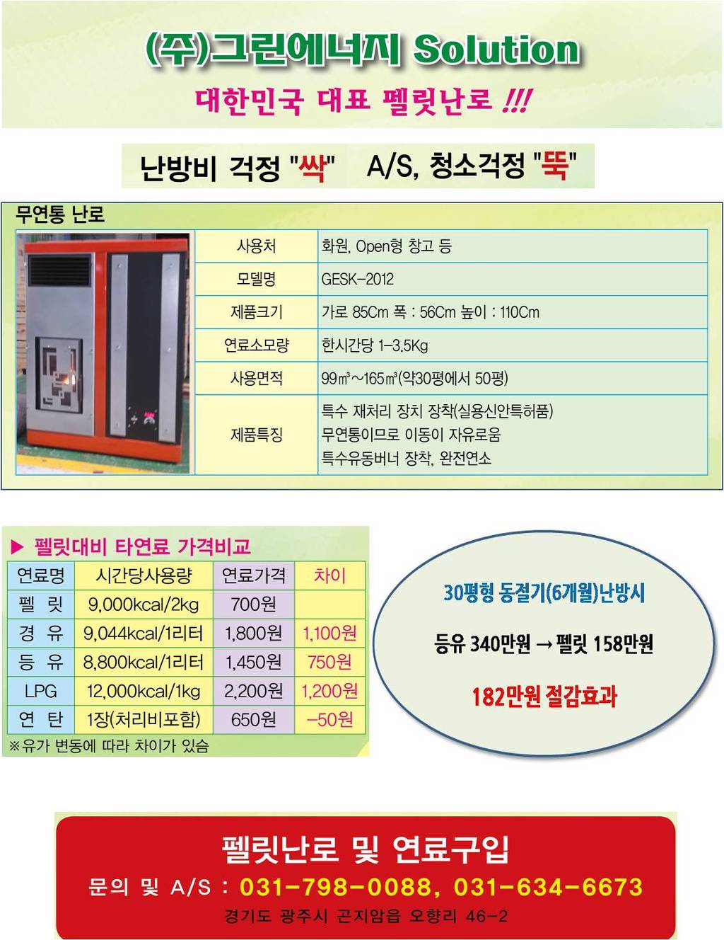 자사의 '펠릿난로'는 기존 열원(기름,전기)에 비해 확실한 난방비 절감효과가 있어 시설하우스 재배농가를 비롯한 일반 소비자분들께도 희소식이 될 것입니다. '무연통 펠릿난로'의 주사용처는 '시설하우스내 작업실, 화원(꽃집), Open형 공장, 골프연습장, 휴게소, 컨테이너내 난방용, 방범초소, 공단'등이며, 참고로 일반 주택용은 기존 제품을 업그레이드를 통해 오는 10월초순경에 자사 홈페이지를 통해 소개됩니다 -
