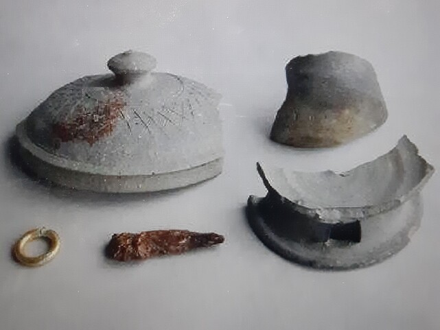 ◇ 통일 이전 고신라 고분군이 북쪽으로 어느 지역까지 분포하고 있을지에 대한 시기적인 논의는 국내 고고역사학계에서 중요한 탐구거리 가운데 하나다. 학계에서는 그동안 통일이전 6세기 전반까지 신라 고분의 최북단 분포 지역으로 강릉을 유력하게 생각해왔다. <△ 사진:> 출토된 부장품들. 대부분 도굴되고 토기와 뚜껑, 금동제 귀고리, 철도자(손칼) 등이 소량 나왔다.
