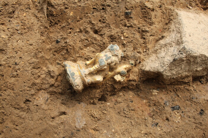 ◇ 1200년 전 신라 장인이 빚은 금동사자상이 강원도 산골 옛 절터에서 세상에 나왔다. 길이 6.2cm에 불과한 작은 상이나, 죽죽 뻗은 갈기와 치켜든 꼬리에 앞다리를 세우고 앉은 위풍당당한 기세가 실감 나게 표현된 수작이다.<△ 사진:> 금동사자상이 출토되는 장면을 찍은 사진이다. 조사구역의 동쪽 경계 부분 토층에서 나왔다. 앞다리를 세우고 앉은 당당한 자세가 뚜렷하게 보인다.