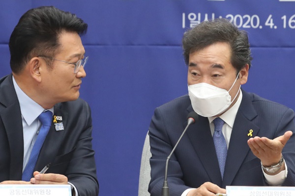 ◇ 송 의원은 7일 자신의 페이스북에 “이번 당 대표의 소명은 코로나 재난극복과 민생경제회복, 개혁 입법 추진 등을 통해 문재인 정부 후반을 성공적으로 마무리하도록 해 정권 재창출을 이뤄내야 한다”고 말했다. <△ 사진:> 더불어민주당 송영길 의원과 이낙연 의원. 뉴시스