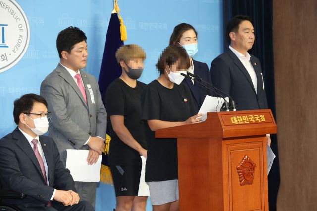 ○··· 6일 서울 여의도 국회 소통관에서 고(故) 최숙현 트라이애슬론(철인3종경기) 선수 사건 관련 동료 선수들이 추가 폭로 기자회견을 하고 있다. |