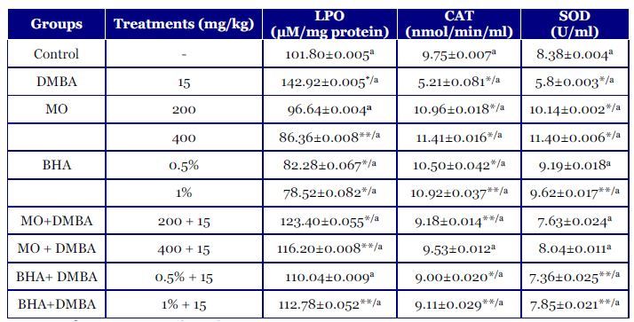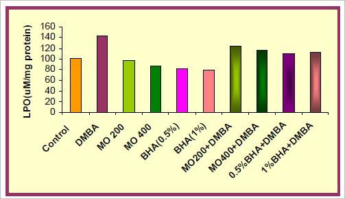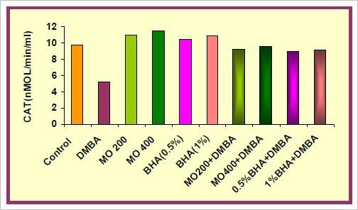 실험결과 ② 발암물질 DMBA를 투여한 생쥐의 생체에서는 40% 수준의 지질과산화가 진행되고 산화억제제CAT와 SOD를 40% 이상 감소시켰다. ③ 모링가(200mg/kg)를 투여한 생쥐는 대조군에 비해 5% 지질화가 감소되었으며, 산화방지효소 CAT는 12.4%, SOD는 14.4% 증가시켰다. ④ 모링가(400mg/kg)를 투여한 생쥐는 대조군에 비해 19% 지질화가 감소되었으며, CAT는 7%, SOD는 36% 증가시켰다.