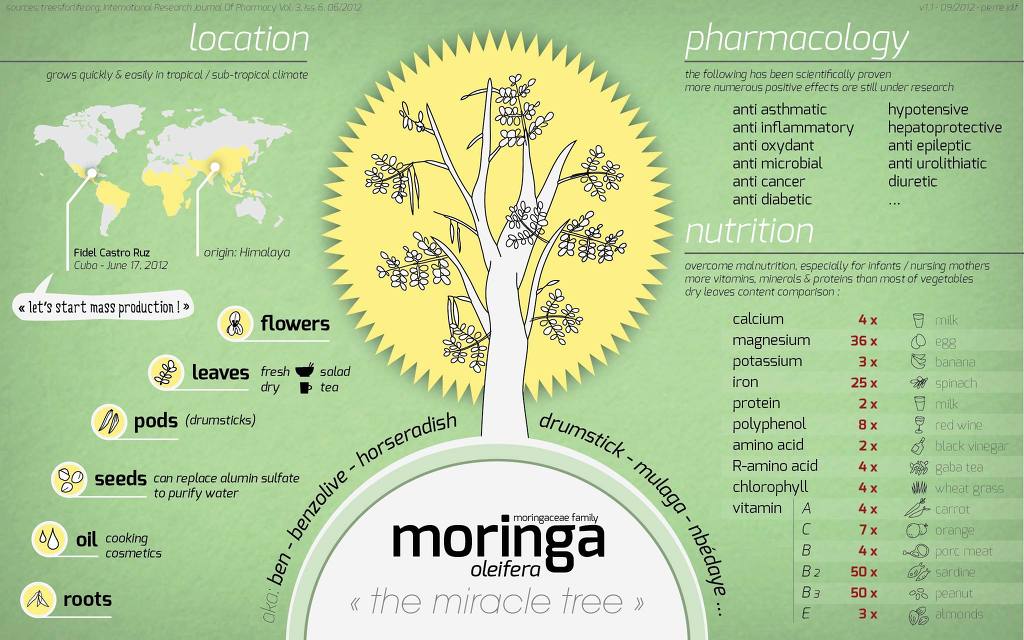 1994년 S. Faizi의 연구자료에 의하면, 모링가잎에서 니아지린(niazirin), 니아지리닌 (niazirinin), 이소티오씨네이트(isothiocyanate) 등의 플라보노이드 성분이 분리되었는데, 이들 성분이 고혈압 환자의 혈압을 낮춰준다는 사실을 밝혀냈다. 참고 : 이소티오씨네이트(isothiocyanate)는 유방암 치료제로 쓰이고 있는 항암제의 주성분이다.