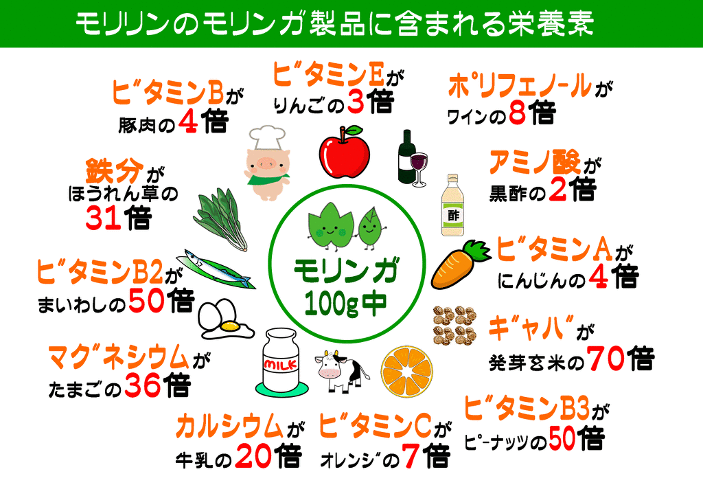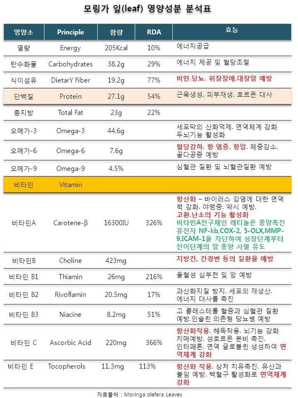 모링가 잎에는 트립토판, 아르기닌, 티로신 등 풍부한 아미노산과 알칼로이드, 요오드 등의 성분이 다량으로 들어있다.