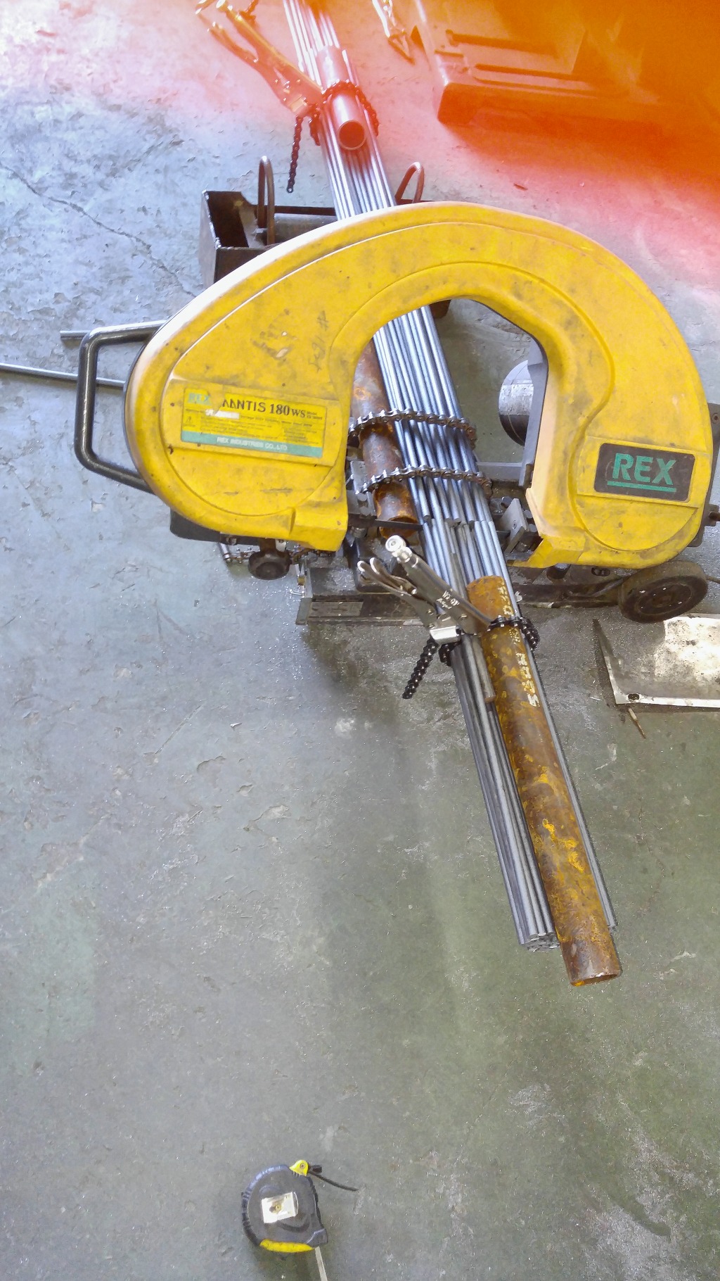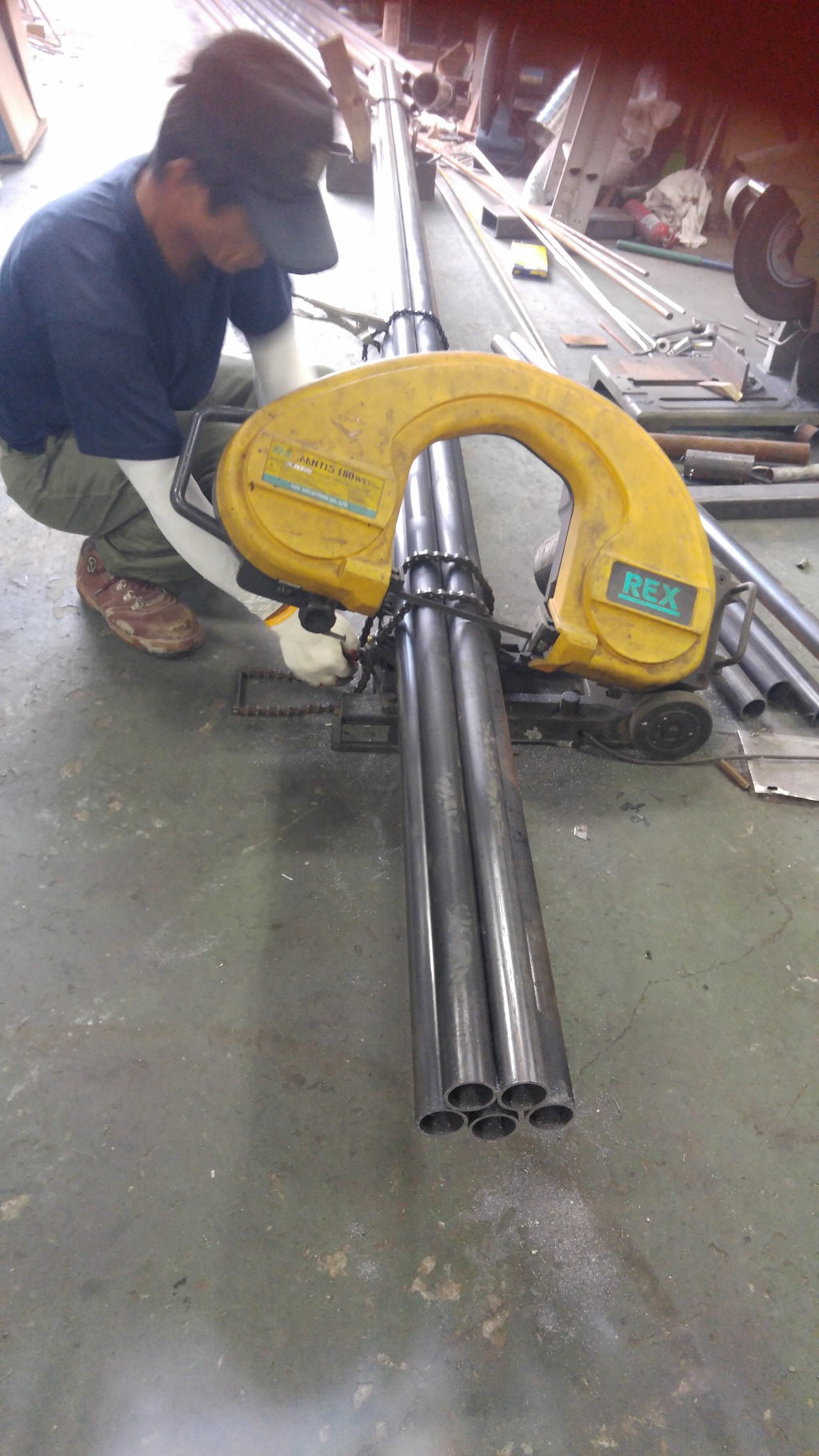 바이스 체인으로 파이프 3개소 묶은 다음 단 한 번에 5개씩 절단해보인 것은 앞으로는 그렇게하라고~