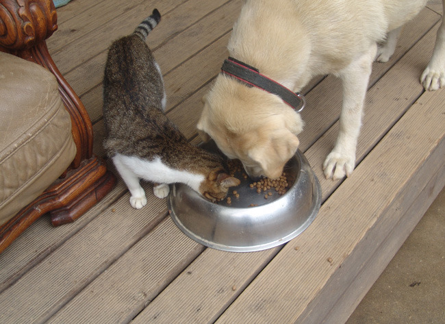 귀여운 녀석들..사료를주니 양이도 먹겠다고 머리를 들이댑니다.