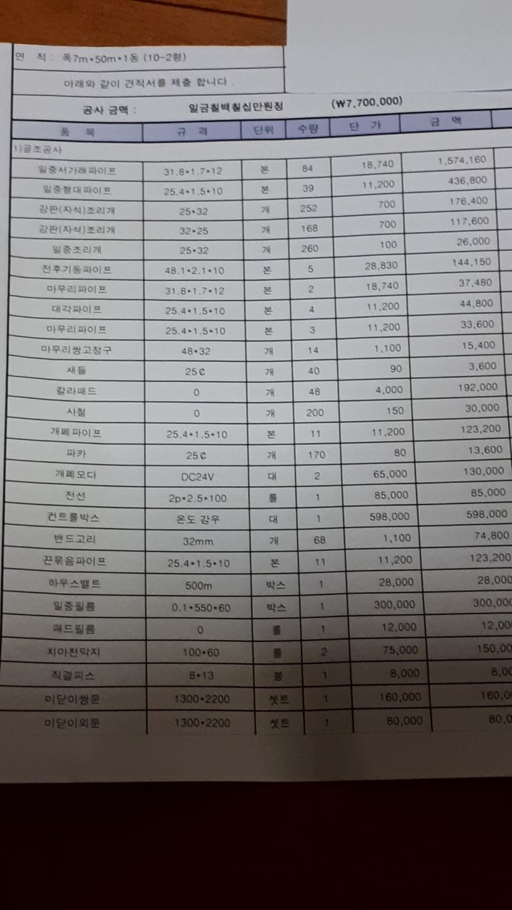 비닐하우스 견적 작성자여덥|작성시간21.02.14|조회수1,325 목록 댓글 14 글자크기 작게가 글자크기 크게가 이 견서 금액이 합리적인 가격인지 궁금합니다.100평의 견석서인데요.200평의 견적은 두배가 되어1540만원이 된다는데 더 내려가야하는것 아닌지요? 다음검색 현재 게시글 추가 기능 열기 북마크 공유하기 신고 센터로 신고 댓글 댓글 14 댓글쓰기 답글쓰기 댓글 리스트 해당 댓글은 작성자와 운영진만 볼 수 있습니다. 해당 댓글은 작성자와 운영진만 볼 수 있습니다. 해당 댓글은 작성자와 운영진만 볼 수 있습니다. 해당 댓글은 작성자와 운영진만 볼 수 있습니다. 해당 댓글은 작성자와 운영진만 볼 수 있습니다. 댓글 전체보기