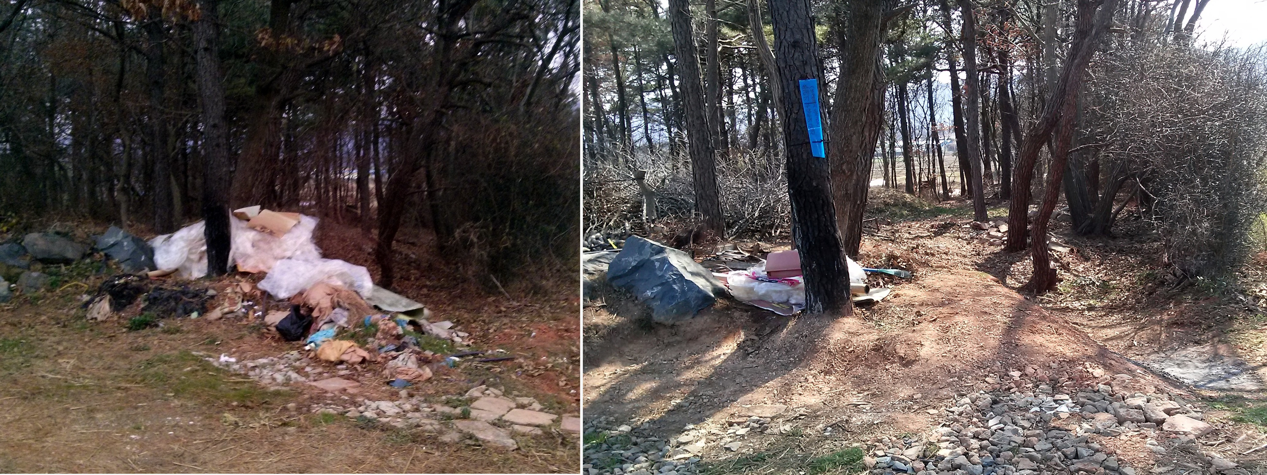 사진좌: 5년전 귀촌시 본 신씨 대문중임야 입구 모습으로 임야 몇곳에 쓰레기가 수톤씩 쌓여있었음.