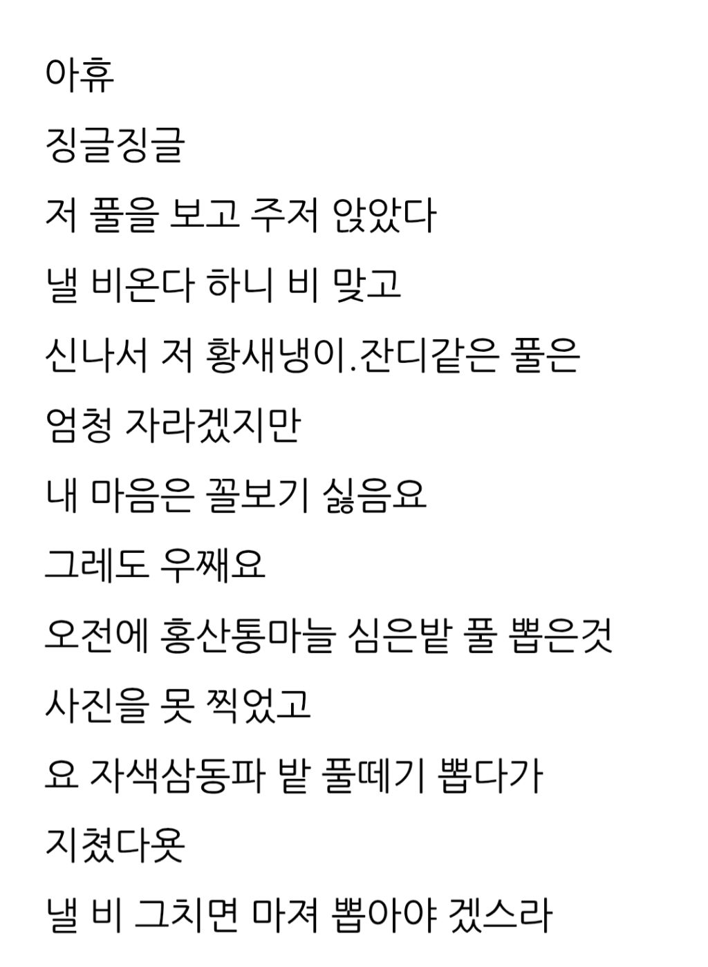 자색삼동파 밭 풀반 작성자이쁜이엄마|작성시간26.04.03|조회수92 목록 댓글 4 글자크기 작게가 글자크기 크게가 다음검색 현재 게시글 추가 기능 열기 북마크 공유하기 신고 센터로 신고 댓글 댓글 4 댓글쓰기 답글쓰기 댓글 리스트 작성자선이 ( 아산) | 작성시간 26.04.03 대단하십니다체력이앉아서 풀뽑는거 힘들어요 답댓글 작성자이쁜이엄마 작성자 본인 여부 작성자 | 작성시간 26.04.03 제가 앉아서 하는것 잘해요늘씬해 갖고 ㅎ 작성자금동길 | 작성시간 26.04.03 그냥 파란색 삼동파같은데요 답댓글 작성자이쁜이엄마 작성자 본인 여부 작성자 | 작성시간 26.04.03 자색입니다밭고랑 자체가다른파이지요제가 파 재벌이랍니다요 댓글 전체보기