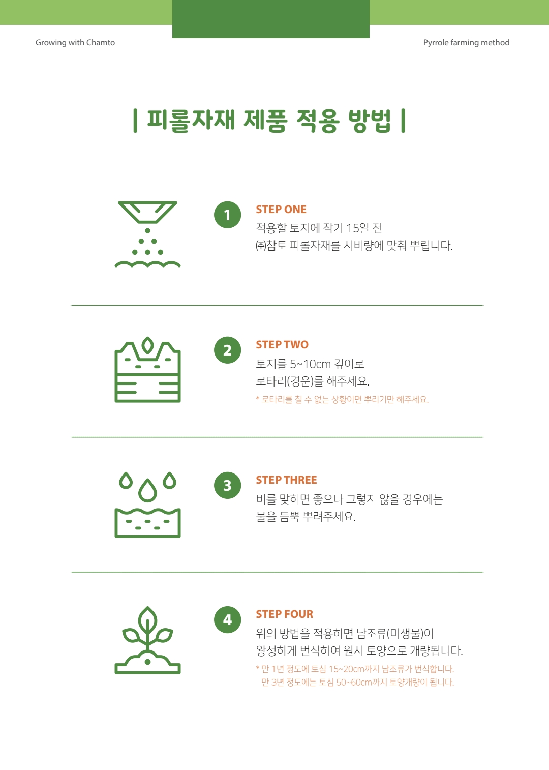유익한 미생물 증식, 킬레이트 물질에 의한 미생물 풍부, 유해성분 분해, 작물의 품질 향상 등 피롤(Pyrrole)농법은 현재 경북의성 마늘주산단지와 전남보성 녹차생산단지, 충남금산 인삼재배지 등에서 시험재배에 들어가 있는 상태며, 경북달성 방울토마토 재배농가와 경북성주 참외재배농가, 충남논산 딸기재배 농가들로부터 큰 인기 속에 사용되고 있다.